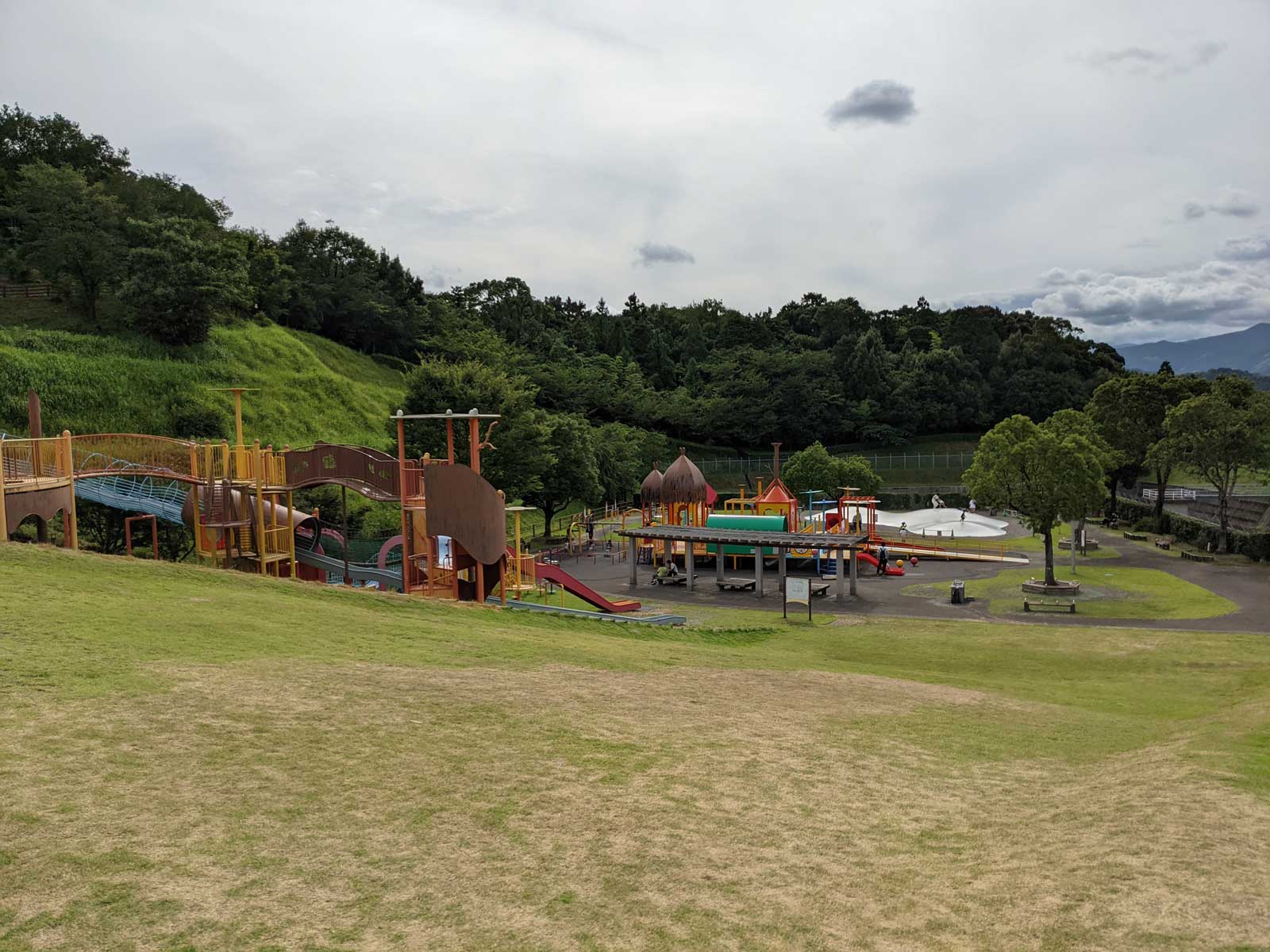 食べた後は「秦山公園」というところで17時まで遊んできた。 遊具があって子供たちが遊んだ後は、芝生広場でバッタ取りに勤しんだ。 海用に虫を入れるケースとか、シャベルとか持ってきてあったので、それにバッタの家を作って、15匹くらい捕まえたバッタを香川県まで運ぶことに。