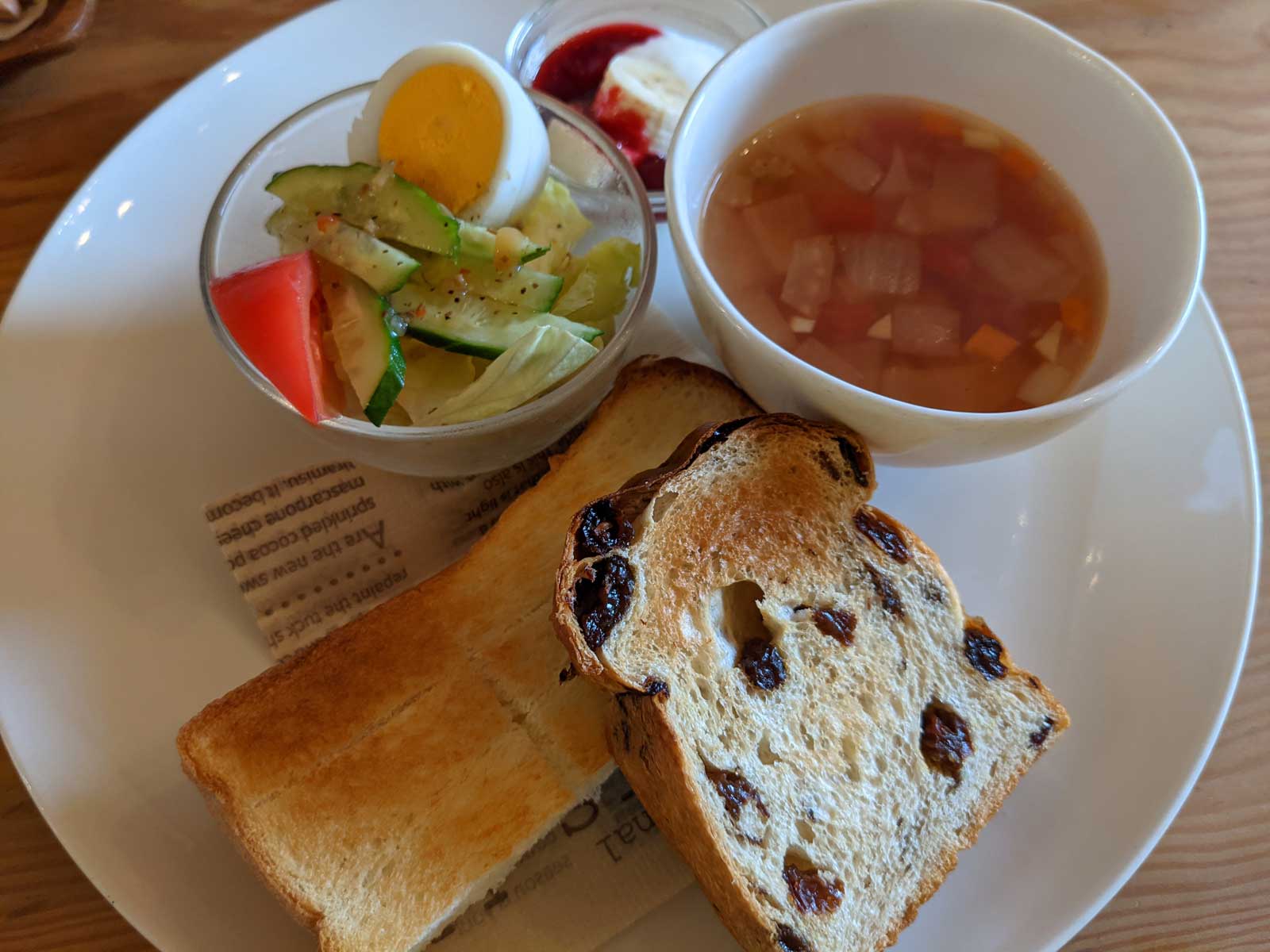 今日は妻が仕事休みなので、朝ごはんは一緒に「茶舎」にモーニングを食べに行く。 9時開店との情報だったけど、8時50分くらいに行ったら、もうOPENの看板が出ていたので入ることができた。 奥に6人がけのテーブルがある個室があり、「そこでもいい」と店員が言うのでそこでモーニングを食べたきた。 700円で、量はちょっと少なめだった、ヨーグルトが美味しかった。