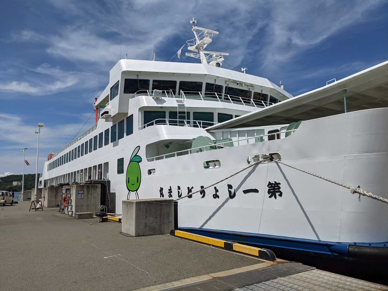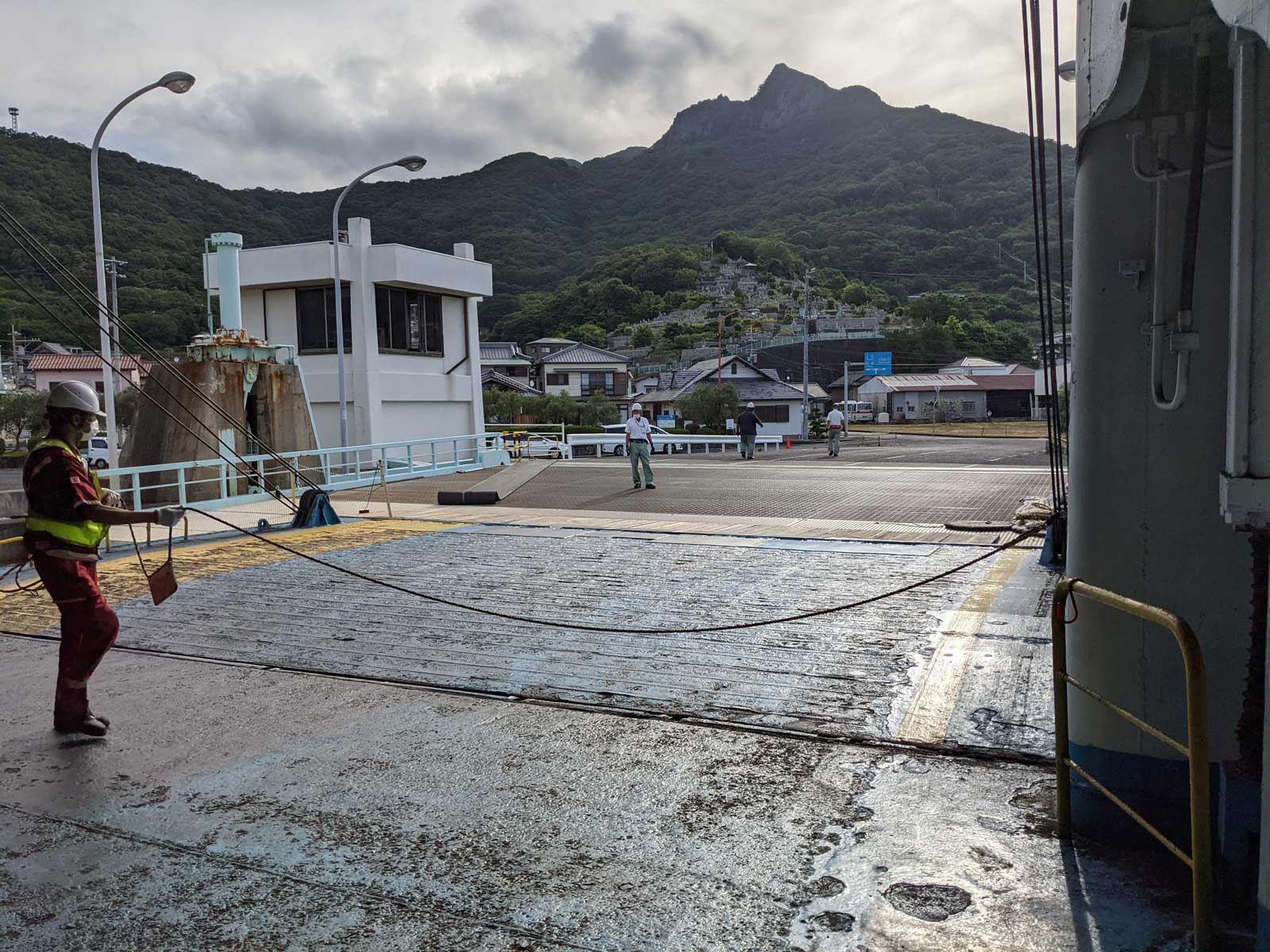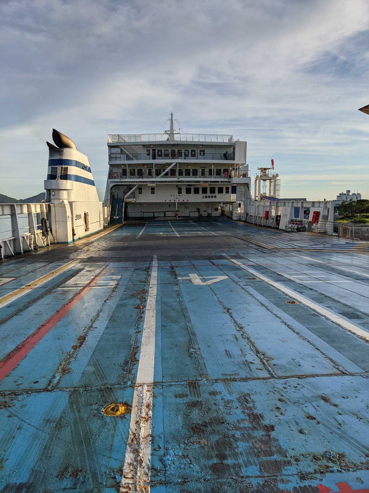 6時出港のフェリーに乗り込み、1時間15分の船の旅。 船に乗ってすぐに朝食でうどんを食べる。 そして甲板に出て景色を眺めたり、客室で横になってくつろいだり。 1時間15分はあっという間ですぐに到着。