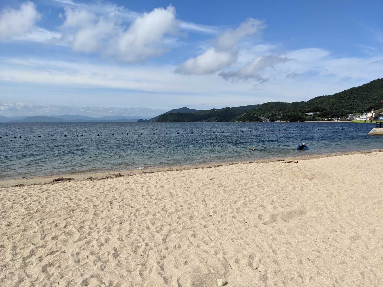 所々休憩しながら、「道の駅 小豆島オリーブ公園」を目指す。 8時40分くらいに到着して、いきなりここで海水浴をする。 水着を持ってきている子たちは着替えて海に入って遊んでいた。 自分は靴だけ脱いで海に入る。 別にズボンや服は濡れてもいいが、着替えは持ってきていない。 濡れてもすぐに乾くだろうけれど。