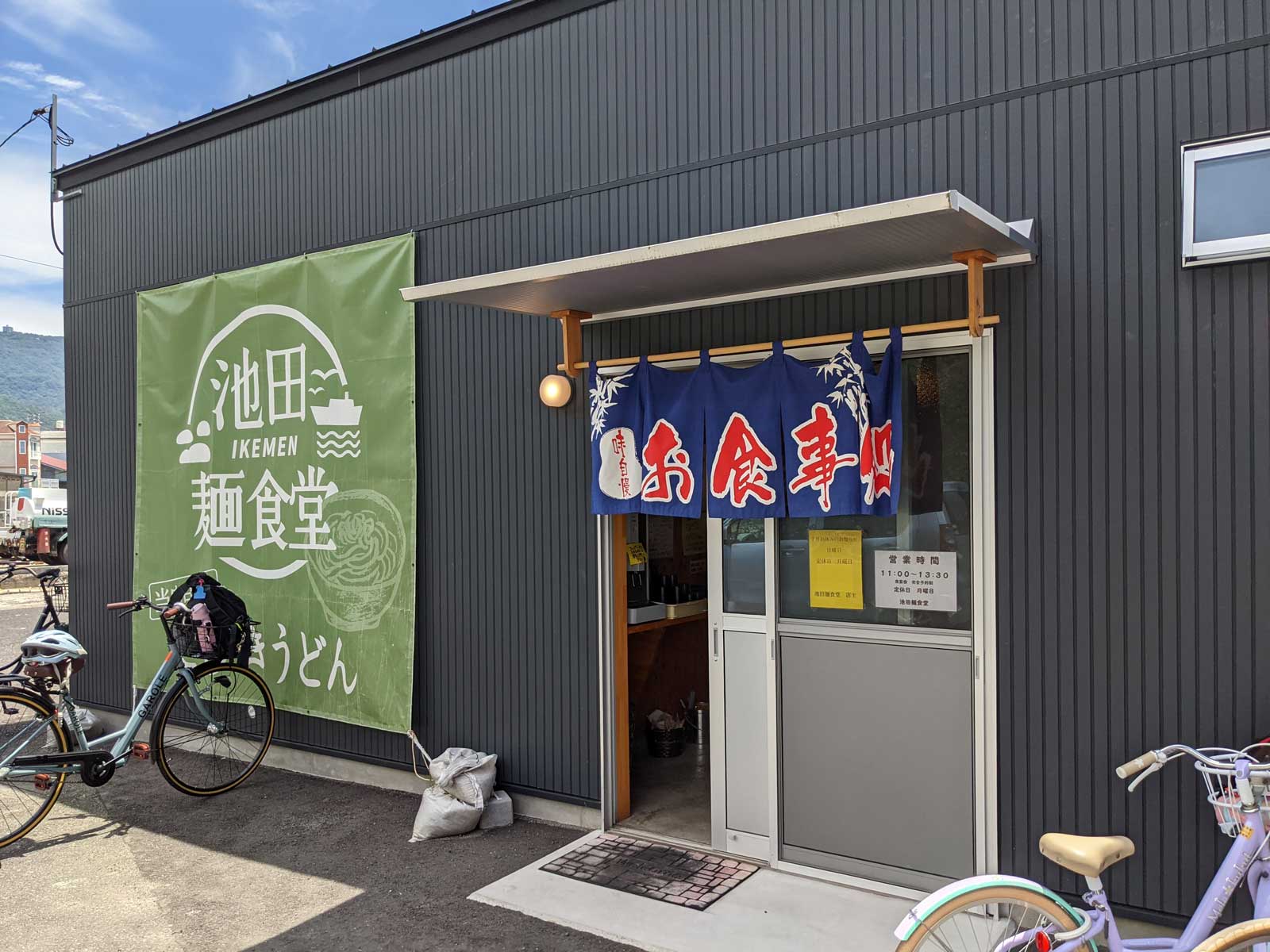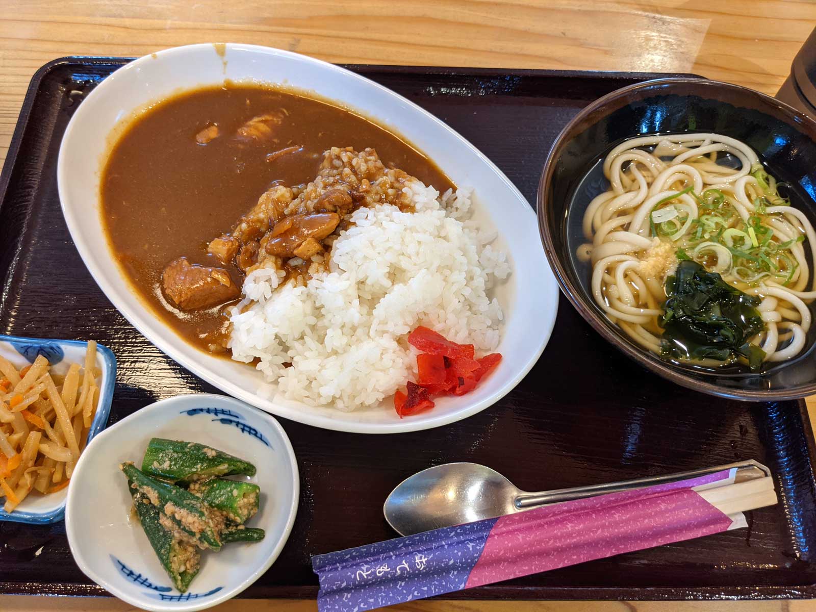 次はお昼ごはんをどこかで食べなくてはならない。 だが、4連休の真っ只中で、小豆島はレンタカーや兵庫・大阪のナンバーが多かった。 店も休日は閉まっているところが多く、池田港の前にある「池田麺食堂」でお昼ごはん。 三女はそうめん、自分はカレーライス+うどんのセットにした。 結構エネルギー消費しててうどんって気分ではなかったので、ご飯系メインでおまけでうどんにしたのだ。 うどんは麺がメチャメチャ細かった。 カレーはまぁまぁ美味しかった。