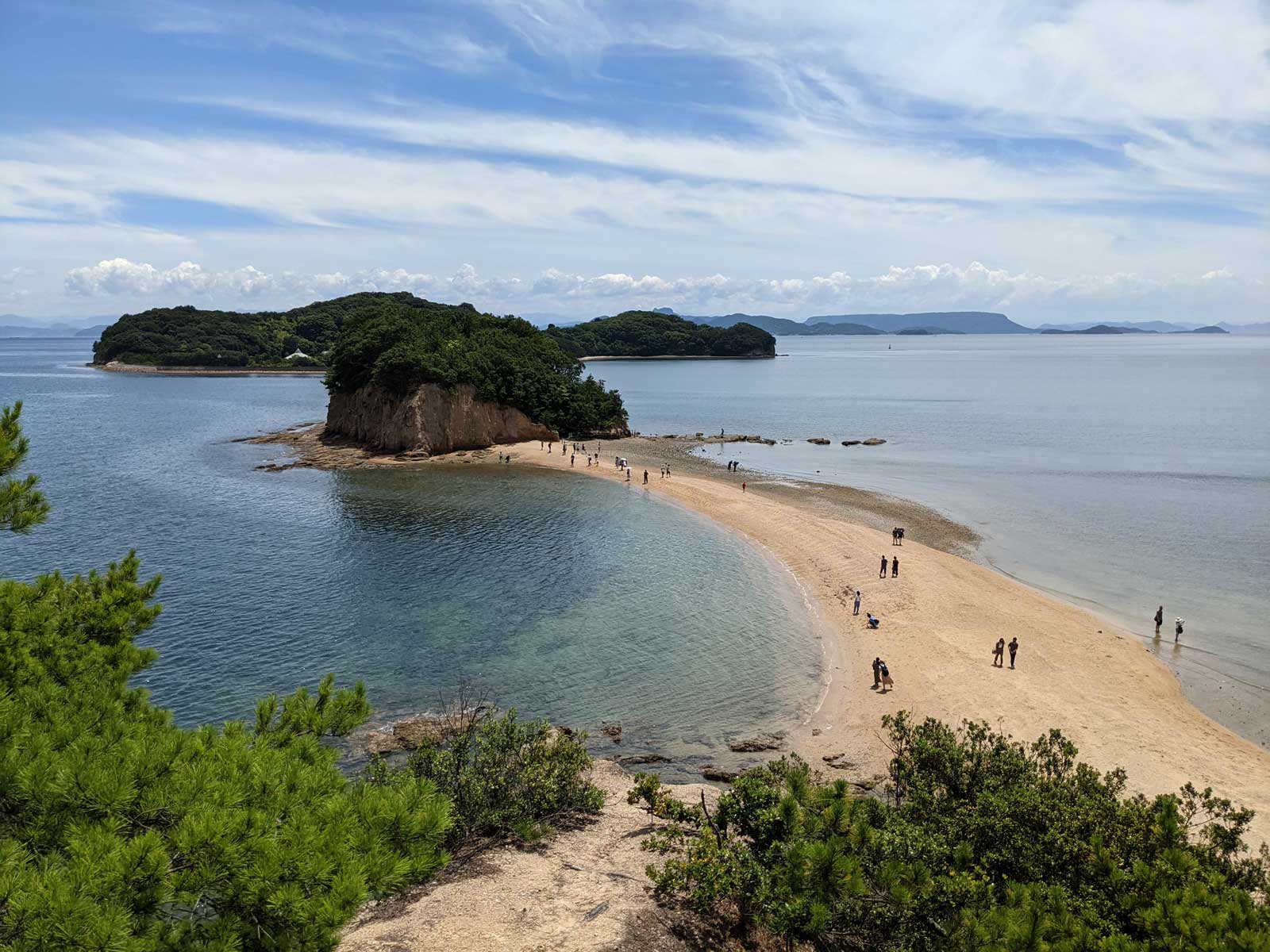土庄ではエンジェルロードに行ってきた。 エンジェルロードとは干潮時のみ砂浜に道が現れて、先にある岩場まで行くことができる。 本来だと干潮の時刻を調べてから来るのがいいのだけど、今日はたまたまだけど、干潮時間帯で渡ることが出来てラッキー。