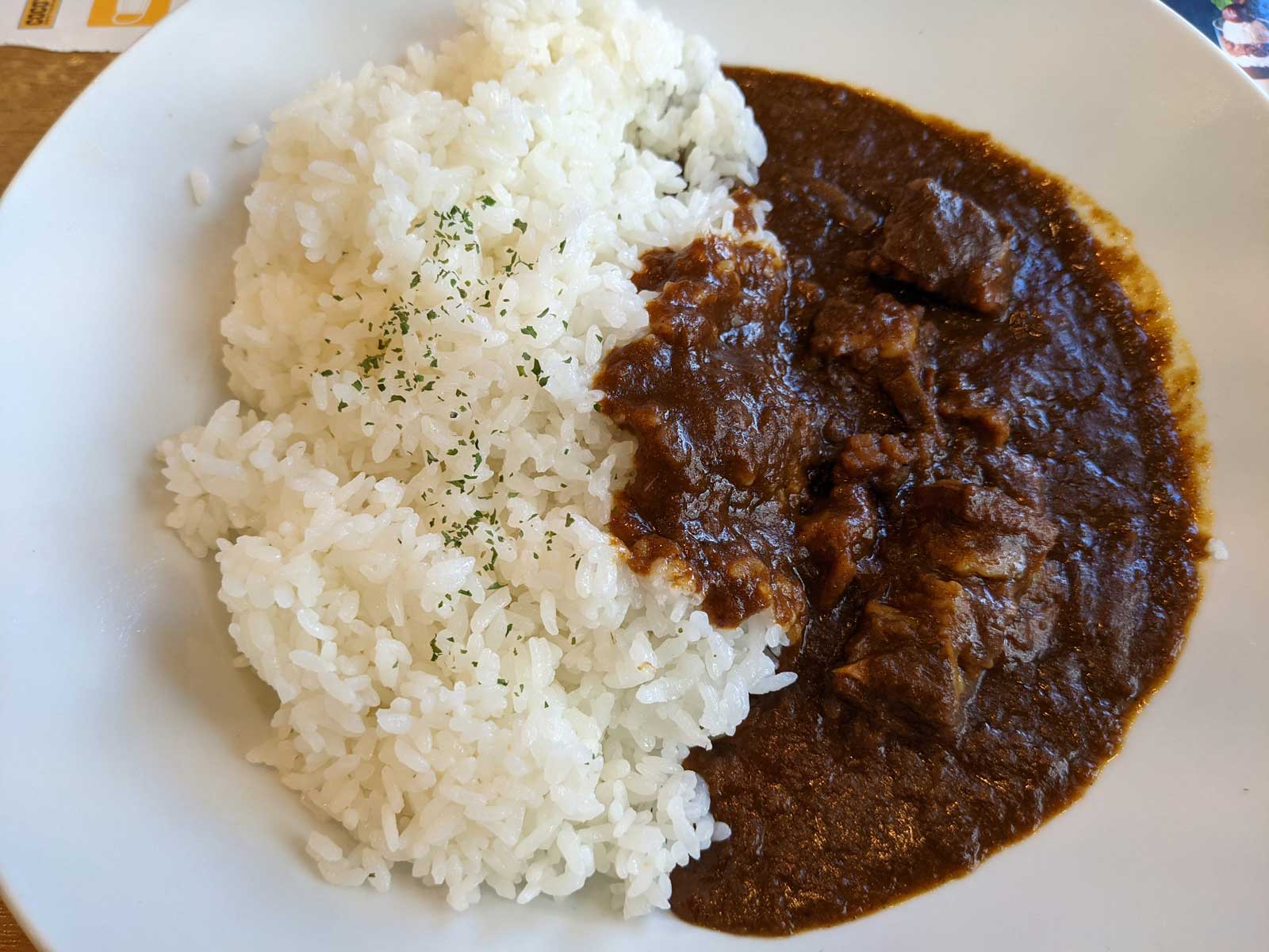 11時38分くらいには入店して、遅くとも10分後には注文が完了しているのに、最初の料理が提供されたのが12時05分くらい。 自分が頼んだビーフカレー。 それから待つこと12分くらい、三女のハンバーグが12時17分くらいに提供された。 その時、既に自分は食べ終わっていた。 そんなに混んでるようには見えないのに、なぜこんなに時間がかかるのか?