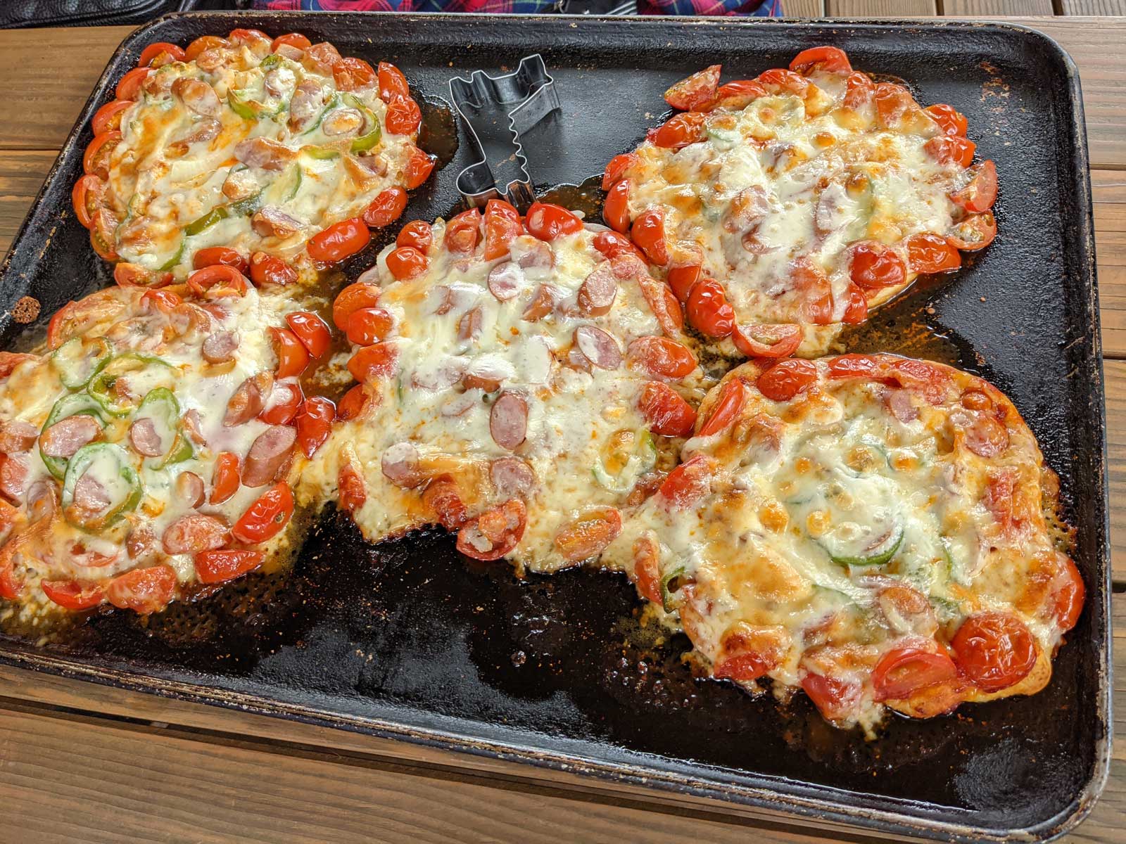 ピザ作りは、丸いボールみたいな生地が用意されていて、それを手の平や指で広げながら20cmくらいの円形に広げる。 具材はタマネギ、トマト、ピーマン、ウインナー。 生地の上に乗せていくのだけど、周りをトマトで囲わないと、最後に乗せるチーズが流れ出てしまうみたい。 具材は思ったよりかなり量があったが、無理やり全部乗せた感じだった。
