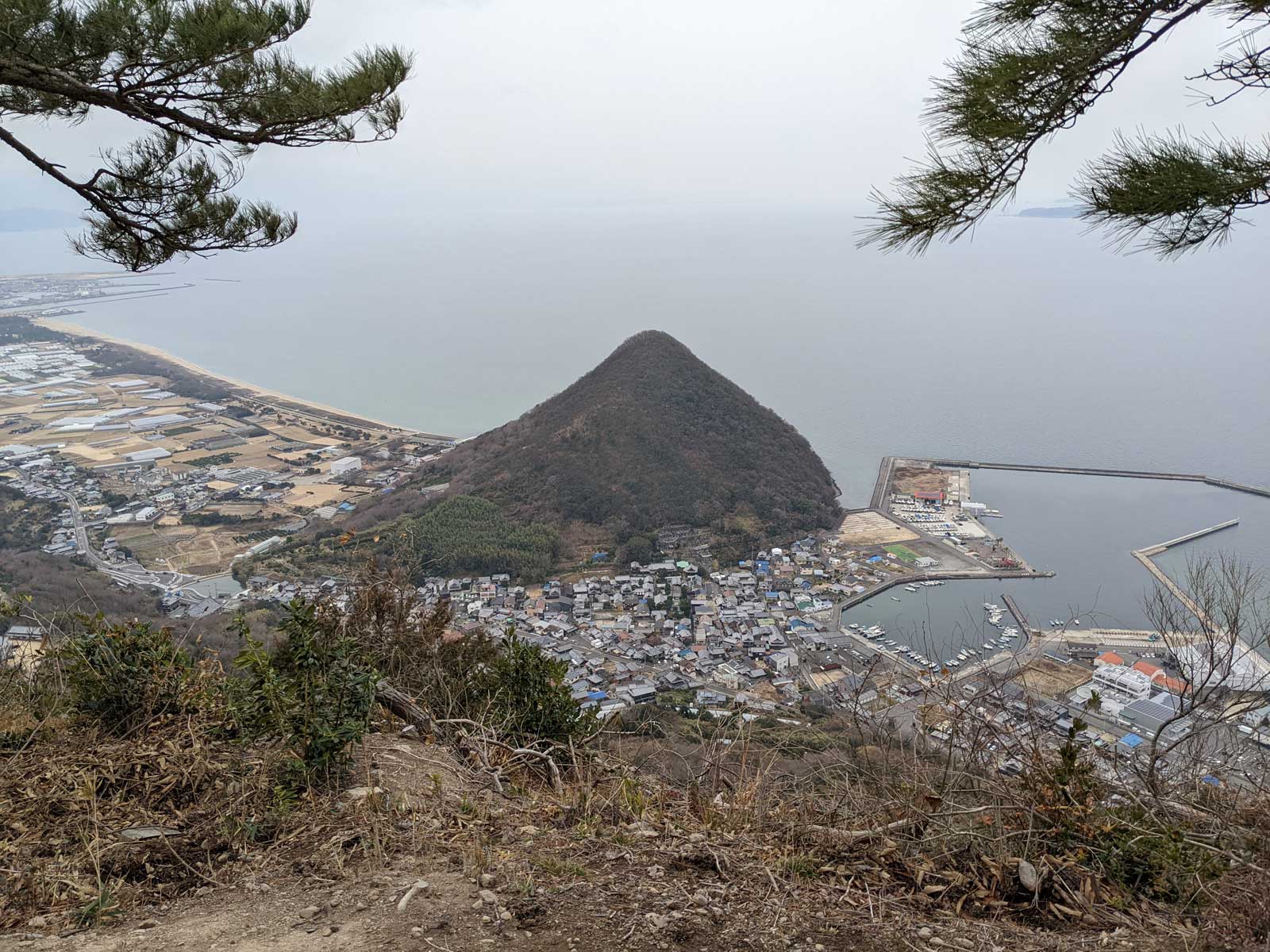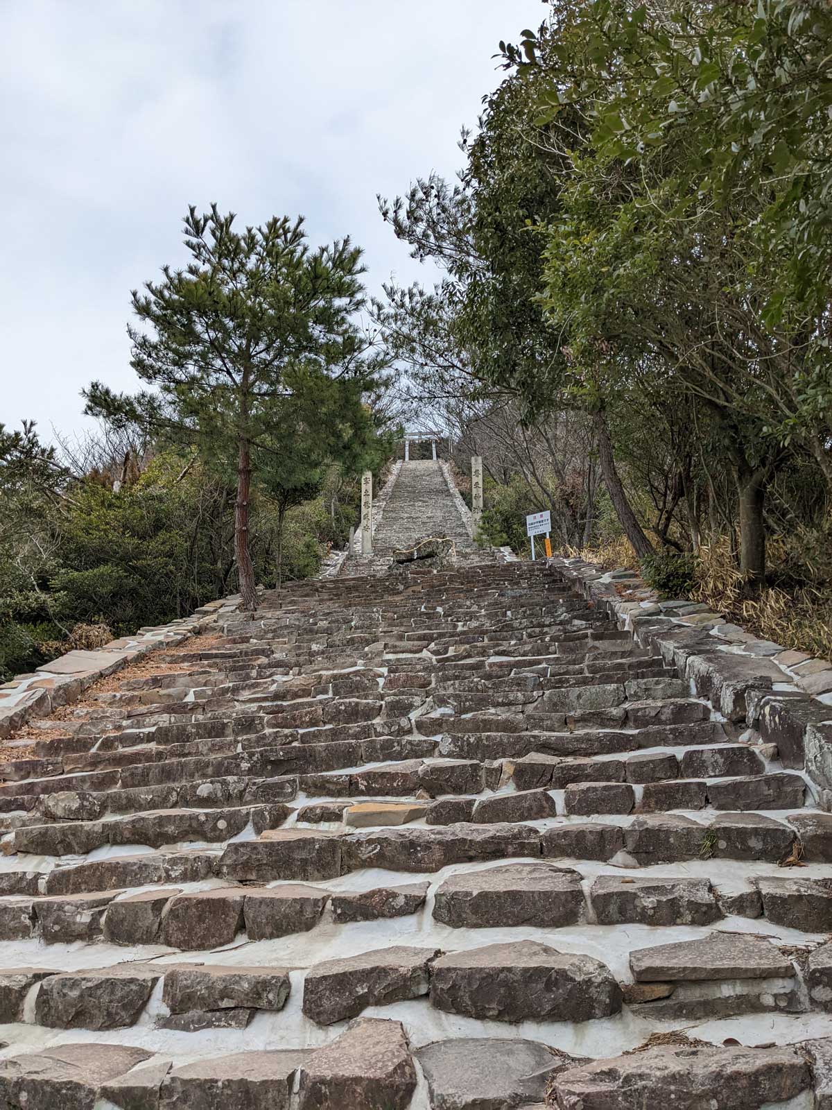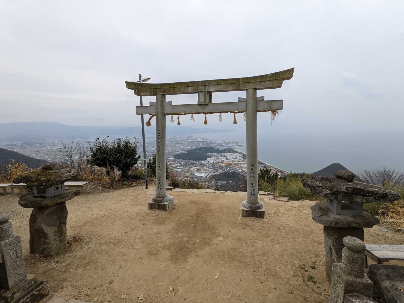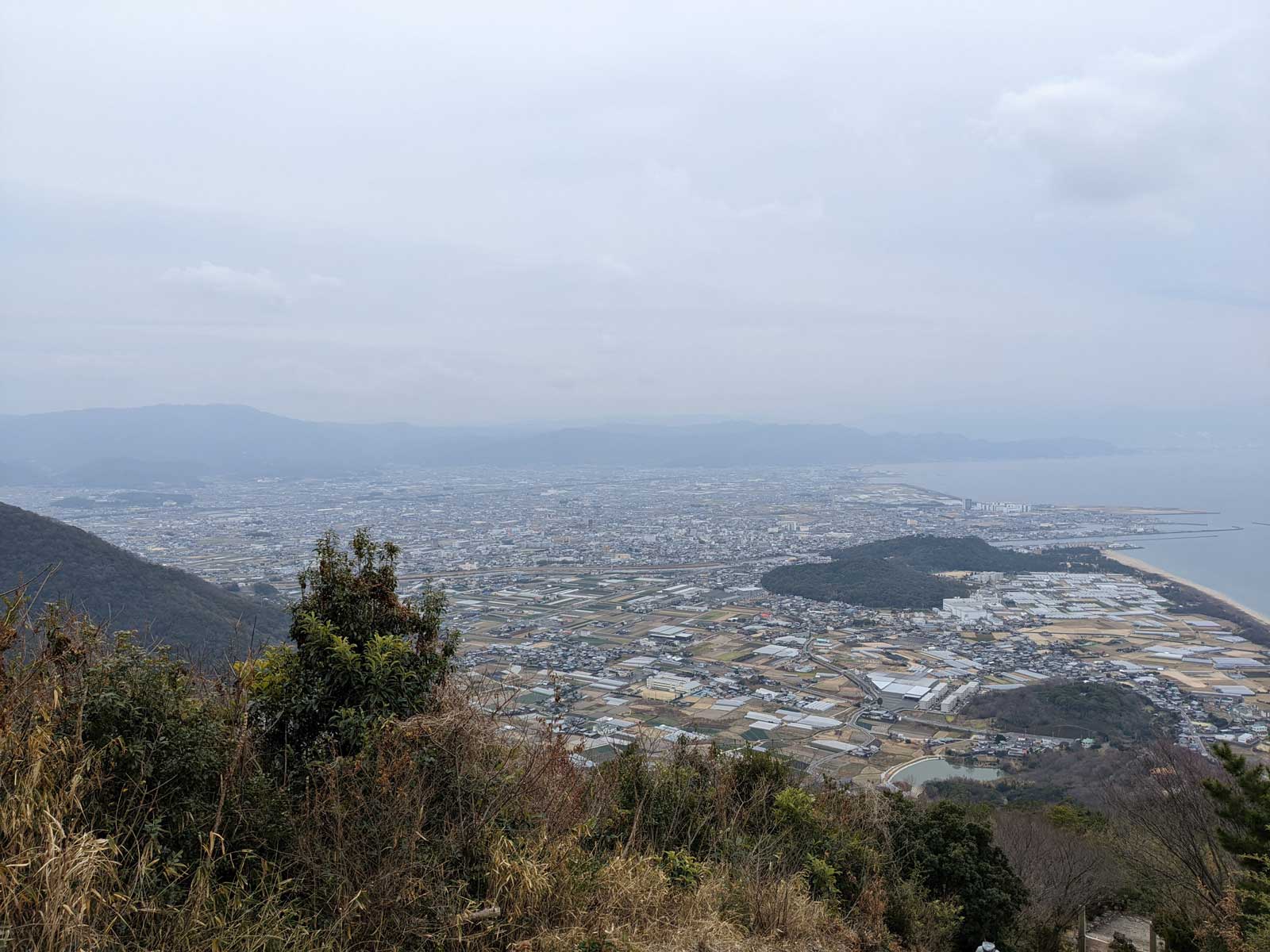 高屋神社は、新型コロナウィルスが猛威をふるいだす直前の2020/01/16に来たことがある。 駐車場までの道のりも覚えていたし、歩くルートの詳細もなんとなく覚えている。 9時半くらいに駐車場を出発して山頂を目指す。 最初のコンクリートの急坂で妻が死にそうになっていたが、歩幅を狭めてペースを緩めて頑張って登ってもらうことに。 頑張って登るか、諦めるかの二択しかないし、まだ始まったばかり。 中腹辺りから観音寺市街地が見えるようになり、暑くもなく寒くもなく、いい感じでどんどんと登って行けて、だいたい50分くらいで山頂に到着。