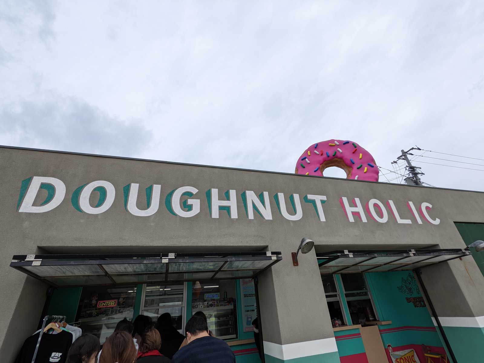 10時50分くらいに駐車場を出発。 次は父母ヶ浜にある「DOUGHNUT-HOLIC」という店へ。 いわゆるインスタ映えのような店なので、自分はあまり乗り気じゃなかったが仕方ない。 11時開店で、ほぼ11時に着いたのに、既に5組くらい並んでいた。 ドーナッツは280円くらいの価格帯で少々高いなと感じた。 まぁ満足してくれたみたいなので良かった。