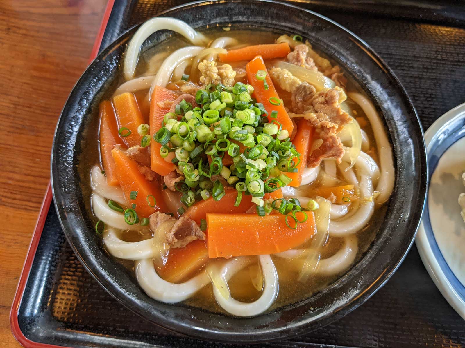 帰りは鳥坂ICから高松西ICまで。 11時50分くらいに高松西ICに到着したので、午後からの時間には間に合いそうな目処が着いたので、お昼ごはんは「上野製麺所」へ。 看板メニューのカレーうどんを食べたが、具材に味が染みていて、とても美味しかった。