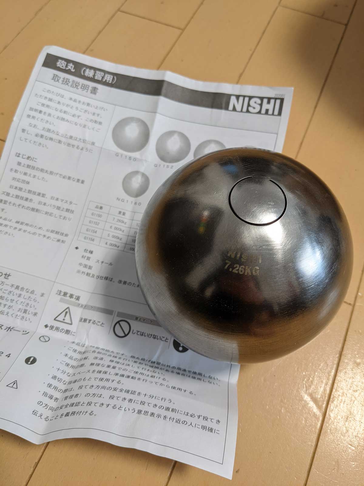 それと、今日砲丸投げの砲丸が届いた。 練習用の砲丸で公式球じゃないので試合では使えないが、重さは7.260kg。 男性アスリートはこの重さの砲丸なのだ。 年代によって重さが違うのだが。