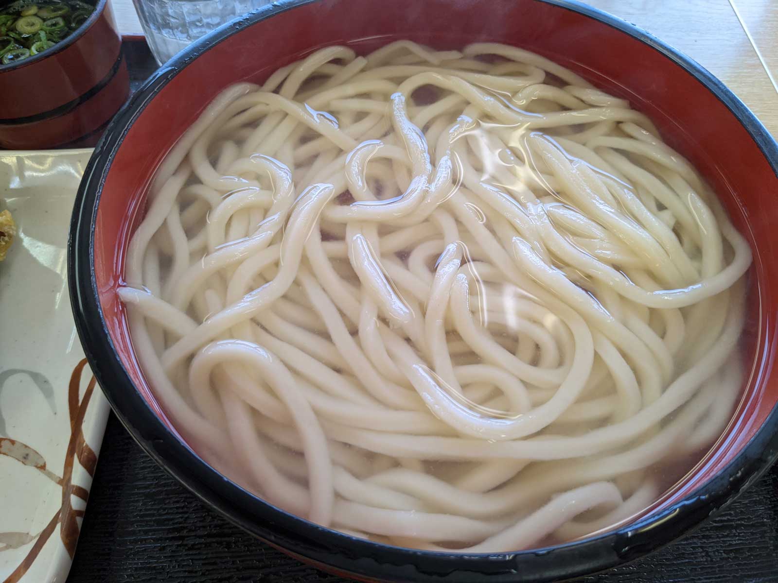 お昼は「源平うどん」で、油だめうどんと舞茸の天ぷら。