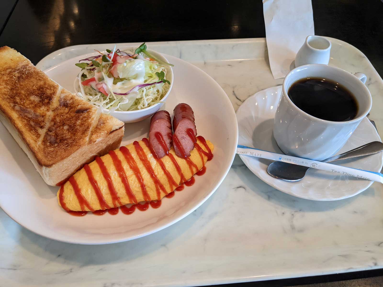 オムレツのモーニングを食べたが、パンが超厚切りですごかった、オムレツも美味しかった。