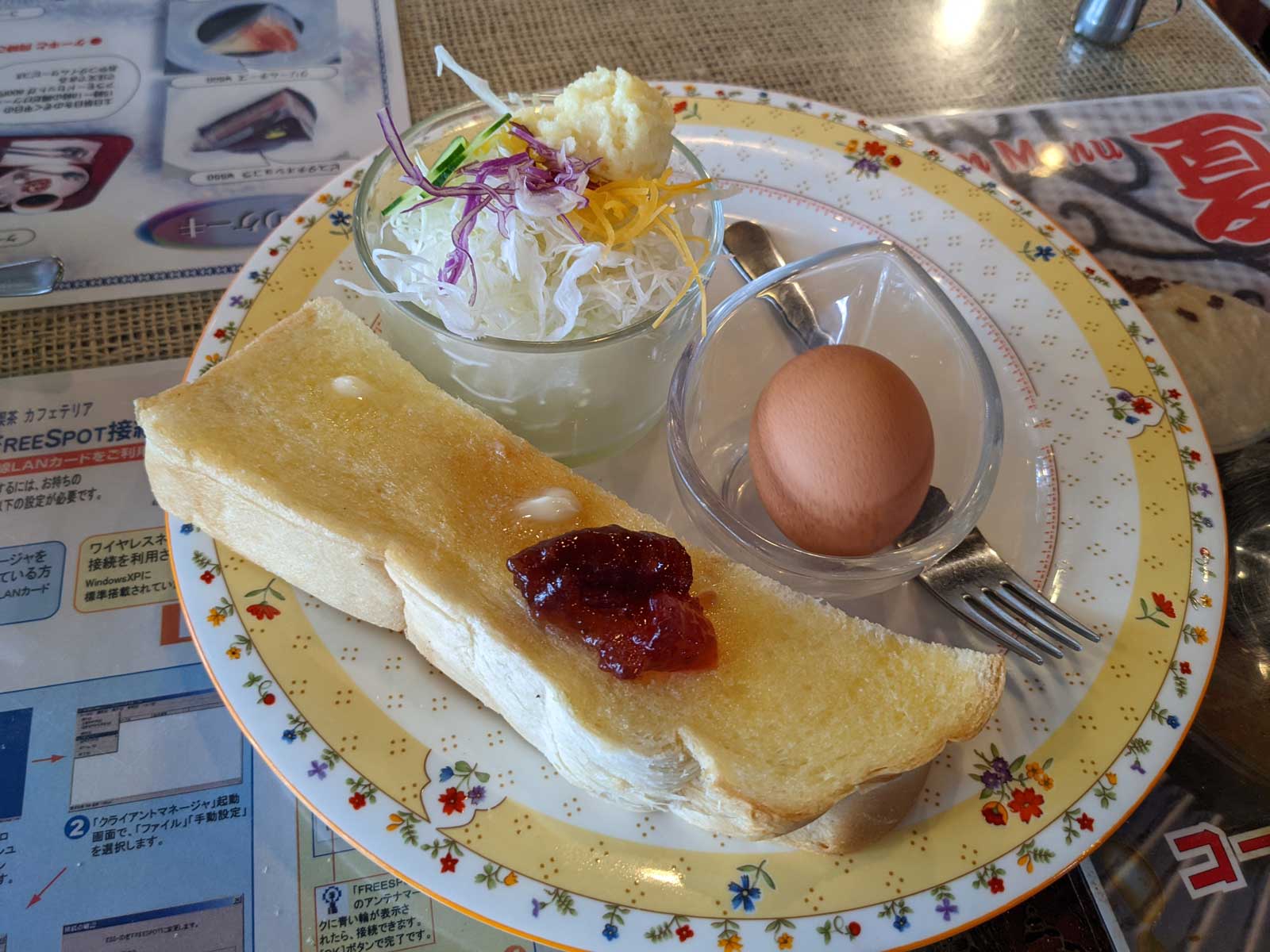 途中で朝ごはんを食べようと、「喫茶カフェ テリア」という、昭和っぽい店があったので、そこで朝ごはん。 モーニングとコーヒーで450円なのだけど、最低料金が500円らしいので、500円の支払いとなる。 意外にもPayPayが使えた。