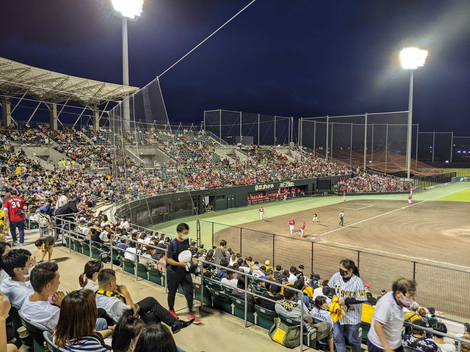 ビックリしたのは、2軍の試合なのに、ユニフォーム来たり、県外ナンバーだったりと、結構熱狂的なファンがいること。 6-4くらいの割合で阪神の方がファンは多かったけど、広島ファンもベンチが赤く見えるほど広島カラーの人が多かった。