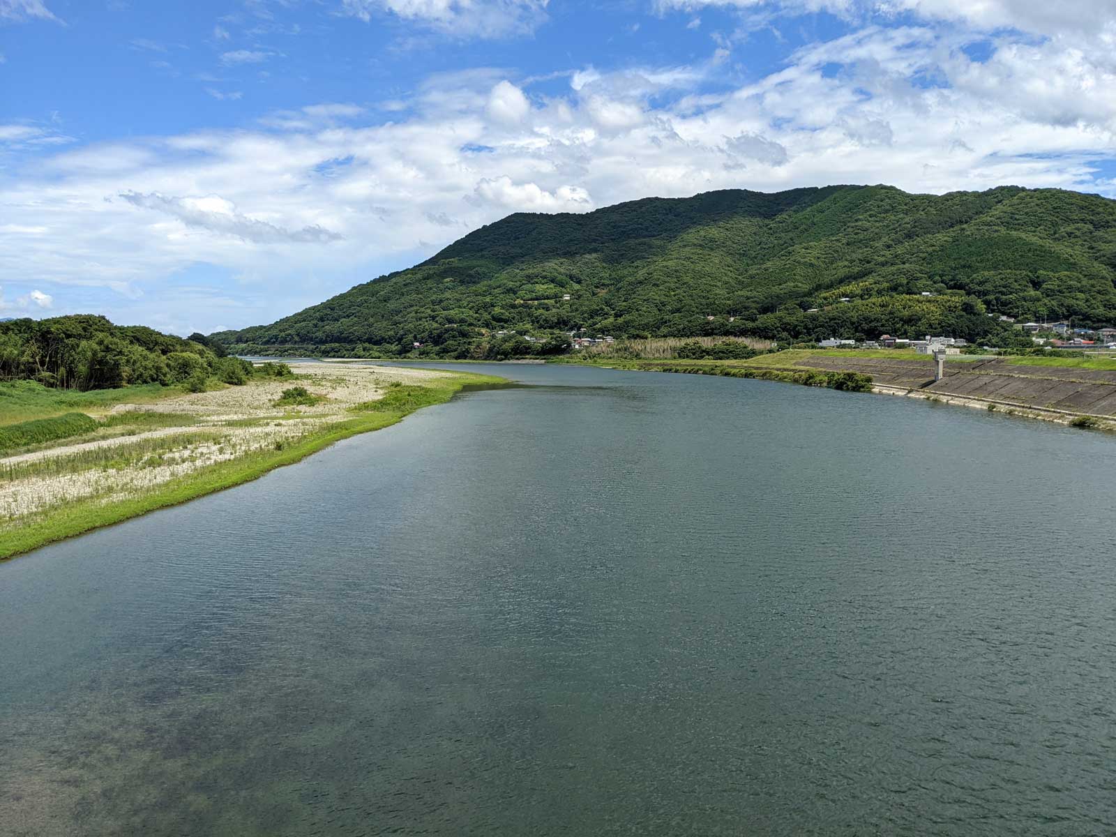 吉野川沿いの国道192号線を東に進んでいくのだが、この道はずっと向かい風で非常に厳しかった。 平坦なので軽く漕いでも時速26kmくらいは出てほしいのだが、軽くよりちょっとパワーを入れて漕いでるのに、時速21kmくらいしか出ず、心が折れそうだった。 だが、ひたすら東に進むしかないので、スピードは出ないがひたすら漕ぎ続けた。