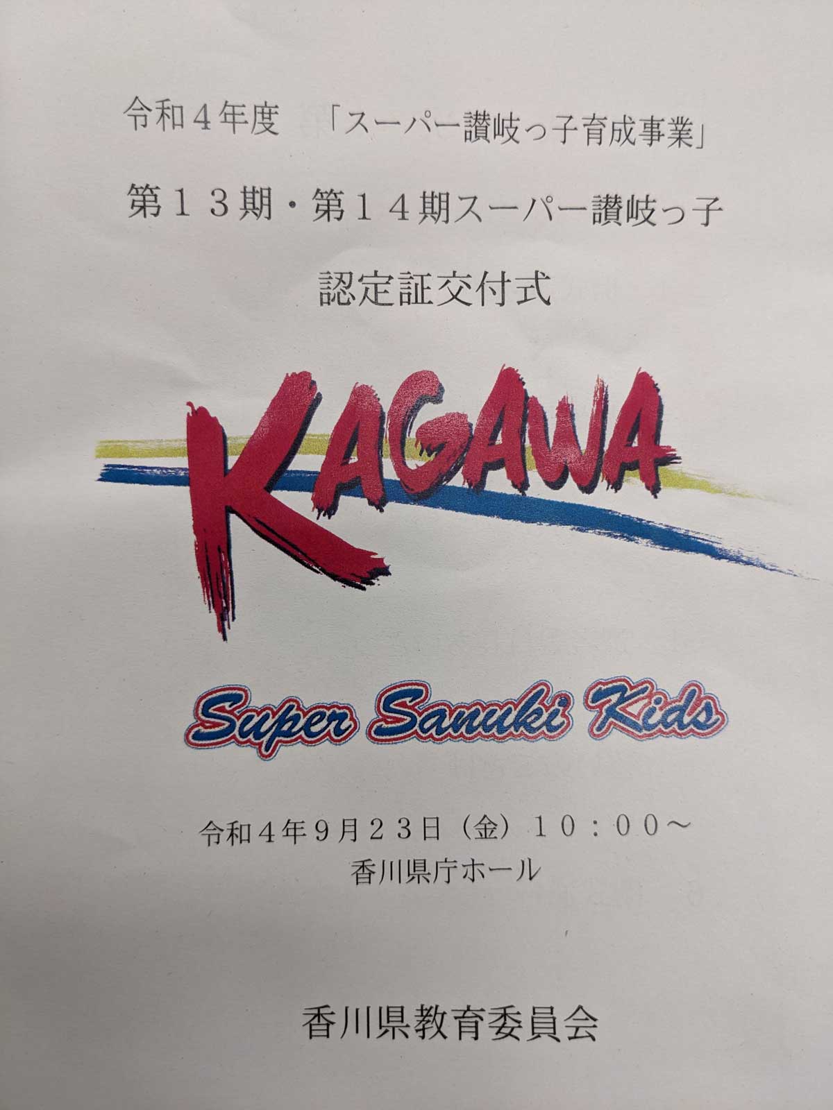 今日はスーパー讃岐っ子の認定式の為、朝から県庁へ。 県庁はなかなか行く機会がないので、今回で2度目だろうか。 一度目は食堂利用しに行ってみただけ。 教育委員会教育長や、育成委員というメンバーがずらりと並ぶ中、一人ずつ名前が呼ばれて認定証を受け取る。 スーパー讃岐っ子の二次選考会に残ったのは男子41名、女子28名。 合格者は男子16名、女子12名だった。 最初の応募数が男子105名、女子74名なので、倍率は男子が6.5倍、女子が6.1倍と、どちらも中々の倍率だった中、合格できたのは嬉しい。