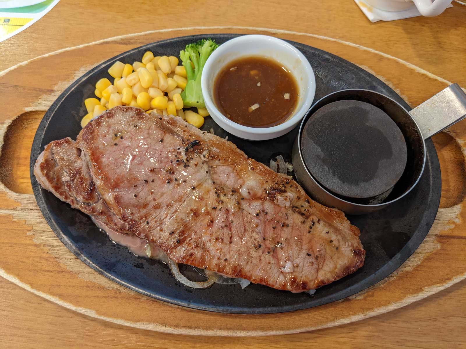 帰宅してシャワーを浴びた後は、お昼ごはんを食べに、妻と次女も着いてきて、4人でココスへ。 次女が「ステーキが食べたい」というので、自分も同じものにして食べた。