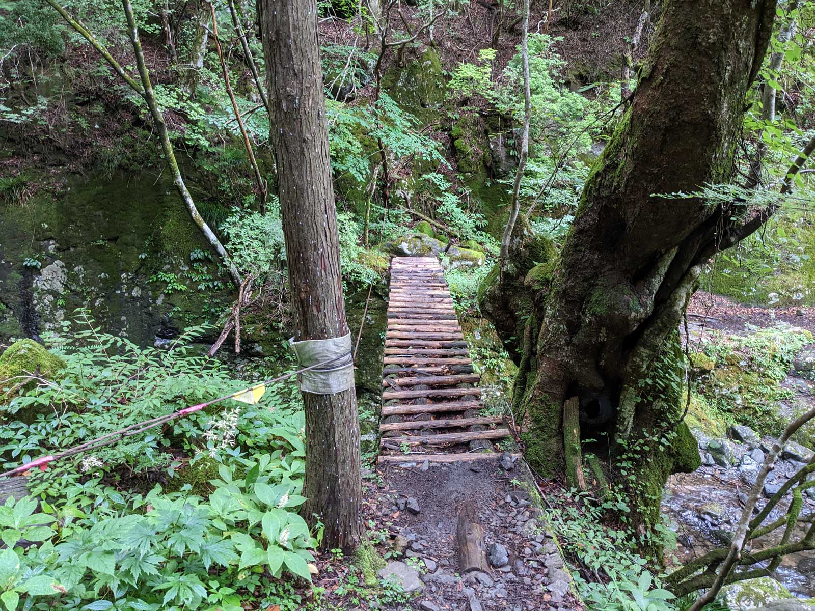 瀬場コースと合流して、そのまま進んでいく。 ところどころ新しいロープが張られていたり、新しい木の階段が組まれていたりと、コースが変化しているのを感じながら歩いて行く。