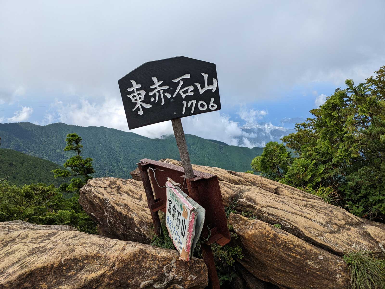 そしてすぐに東赤石山に到着。 ここは足場が悪いので、100mくらい東に行った所にある、三角点の広場でお昼休憩にすることに。