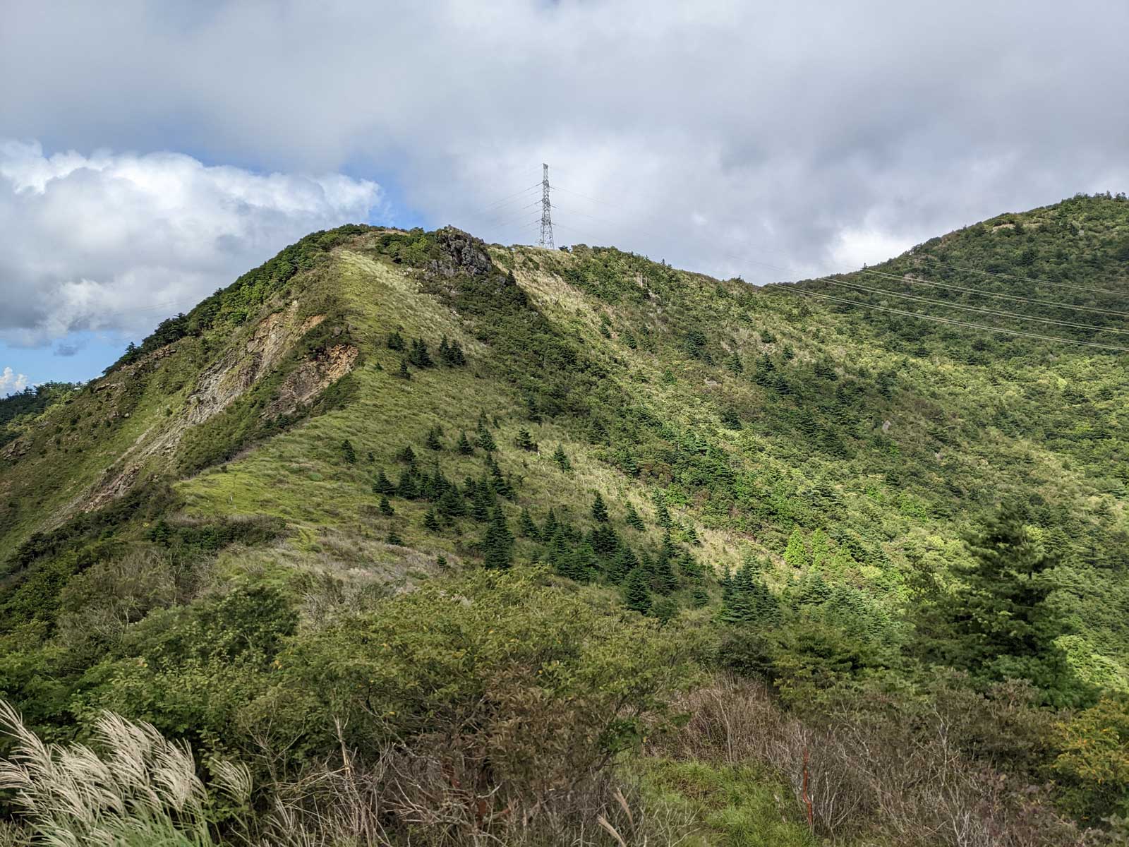 ピンクテープを頼りにどんどんと降りていく。 だいぶ降りた所で鉄塔巡視路の分岐が出てきたが、ここでルート選択を誤って、南東の1232mピークの方に向かう道に行ってしまった。 床鍋ルートを歩くのどころか、登山に来るのがかなり久しぶりなので、すごい大雑把には覚えているが、細かい道は覚えていなかった。 10分程歩いた所で違和感を感じて、とりあえず休憩することに。 水分取ったりエネルギー補給したりしながら、改めて地図を見て、自分のいる場所を調べ、鉄塔巡視路分岐からここまで歩いた10分間の道中を思い浮かべ、地図と見比べる。 鉄塔巡視路から登り返しがあり、体感だけど50m近く登ってきていると思う。 地図上の床鍋ルートには登り返しがない。 地図には載らない程度の登り返しはあるかもしれないが、50mの登り返しがあったら、それは地図を見ればすぐにわかる。 正規ルートでは高圧電線の下をくぐるのだが、今歩いてきた道中ではくぐった覚えがない。 ただし、樹林帯の中を歩いているし、上を見て歩いているわけではないので、見逃している可能性もある。 そんなで、色々なことを加味した上に出した結論は「ルートが間違っている」。