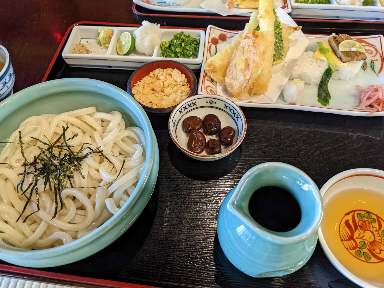 次は「山田家」へ。 平日の10時なのでガラガラだった、他にもお客さんはいたが、3組くらい。 本館の方の座敷に案内されたのだけど、この建物入ったの初めてかもしれない。 ここでお腹いっぱいになってしまいそうだったが、せっかく豪華系のうどんの店にきたのに、かけうどんやざるうどんだけを頼むのはもったいない。 なので、ザル天うどんを頼んだが、かなりお腹いっぱいになってしまった。
