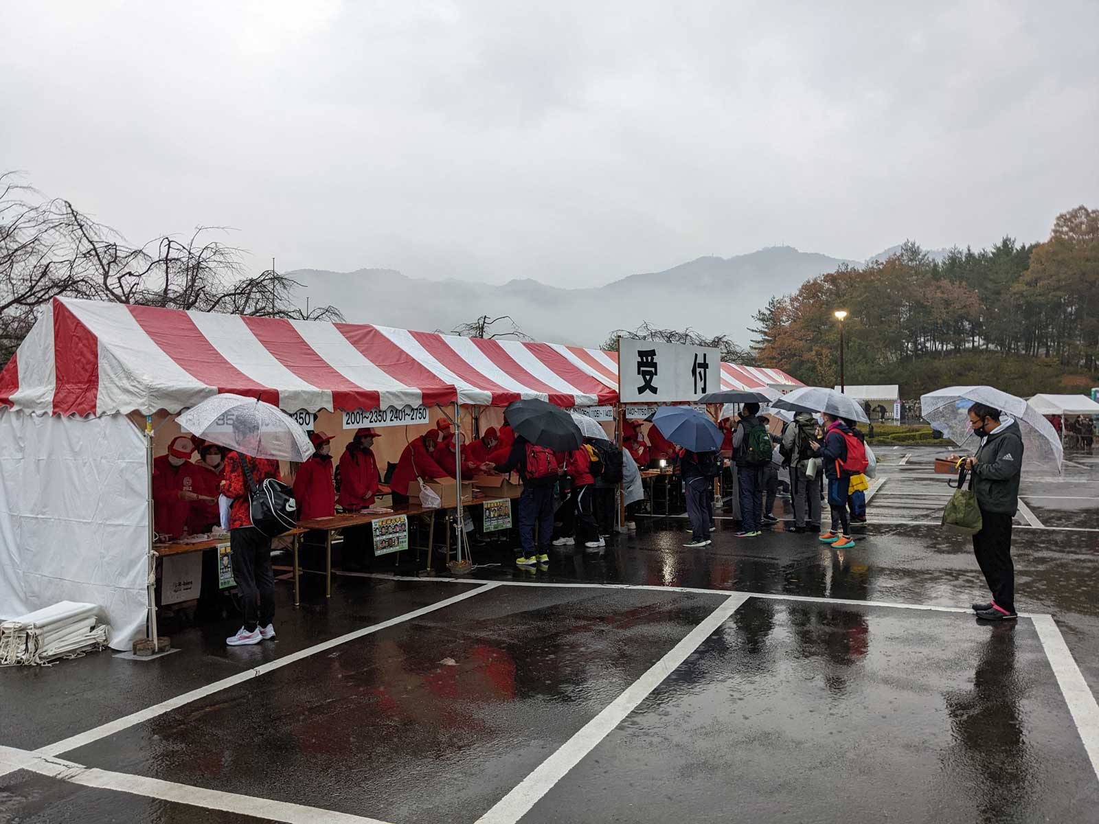 ゴール後は誘導にしたがって、ドリンク、完走Tシャツをもらって、計測チップを外す。 係員がやってくれるが、計測チップは自分で外したいので、自分で外した。 豚汁、しょうが湯、熱いお茶をもらって、ようやく雨が当たらない体育館の中へ。 上から下まで全身ずぶ濡れなので、着替えないといけないが、ゼッケンのついているウェア姿で写真を撮っておかないといけないので、着替えとスマホを持って、また雨の中へ。 近くのスタッフに写真を撮ってもらってから、着ていたものを全部脱いで、乾いているものへ着替えた。