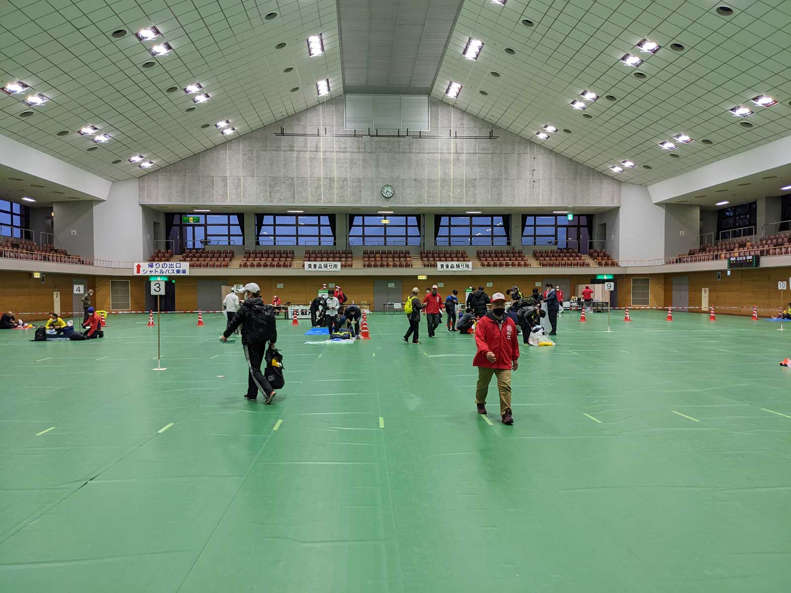 車の中に忘れ物がないようにしっかりと確認して、シャトルバスに乗ってマラソン会場である「三段池公園」へ。 受付を済ませて参加賞などをもらってから体育館へ。 まだ7時過ぎなので体育館はガラガラ。 だけど、これが足の踏み場のないくらい混雑するのを知っている。 通路沿いは外が雨なので、皆濡れた靴で歩くだろうから濡らされると思って、なるべく奥の壁のほうにレジャーシートを敷いて陣取る。 レジャーシートはあると非常に心強いのを過去の経験から知っている。
