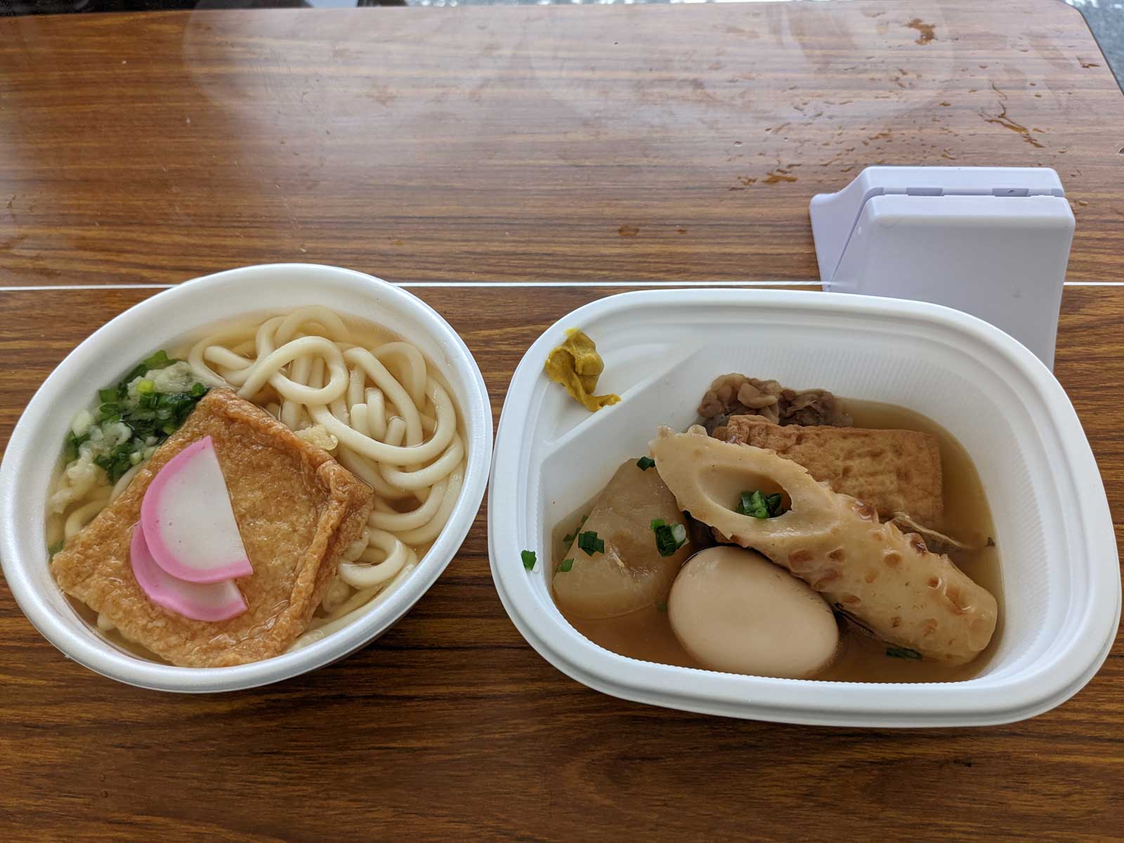 飲食ブースがあるので、そこでうどんとおでんを500円ずつで購入。 汁まで飲んで体を温める。 外は強い雨で、今日は傘持ってきてないので、福知山駅に向かうシャトルバスに乗るのにかなり濡れてしまった。