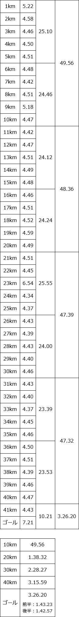 21.1kmの中間点通過が1時間43分23秒。 前々回のしまだ大井川マラソンより37秒ほど速く通過している。 このペースで後半いければ、3時間26分46秒くらいになるはず。