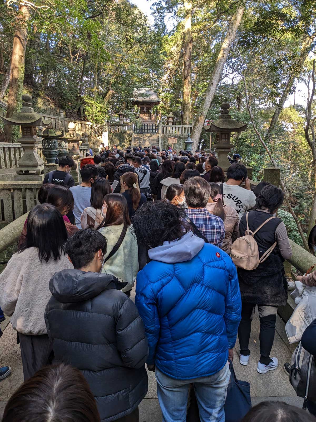 出店が出ている地帯を通過し終えて馬のいる部分で一旦集まってトイレなど行っていたのだが、男子が1名行方不明になってしまった。 スマホを持っていないので探す手段がなく、とりあえず本宮まで行ったが人が多すぎて見つからず、どこに行ったのかすらわからない。 監督が金刀比羅宮等に電話して迷子を探してもらう手続きをする。 他のメンバーはとりあえず奥の院を目指して歩いていった。 迷子を探すのに警察が動くことになった。 かなりの混雑でのトラブルに対応するためだろうか、本宮に警察官の詰所が出来ていて、そこの警察官が対応してくれていたらしい。 結局迷子は、奥の院まで一人で行っていたらしく、そこで発見された。