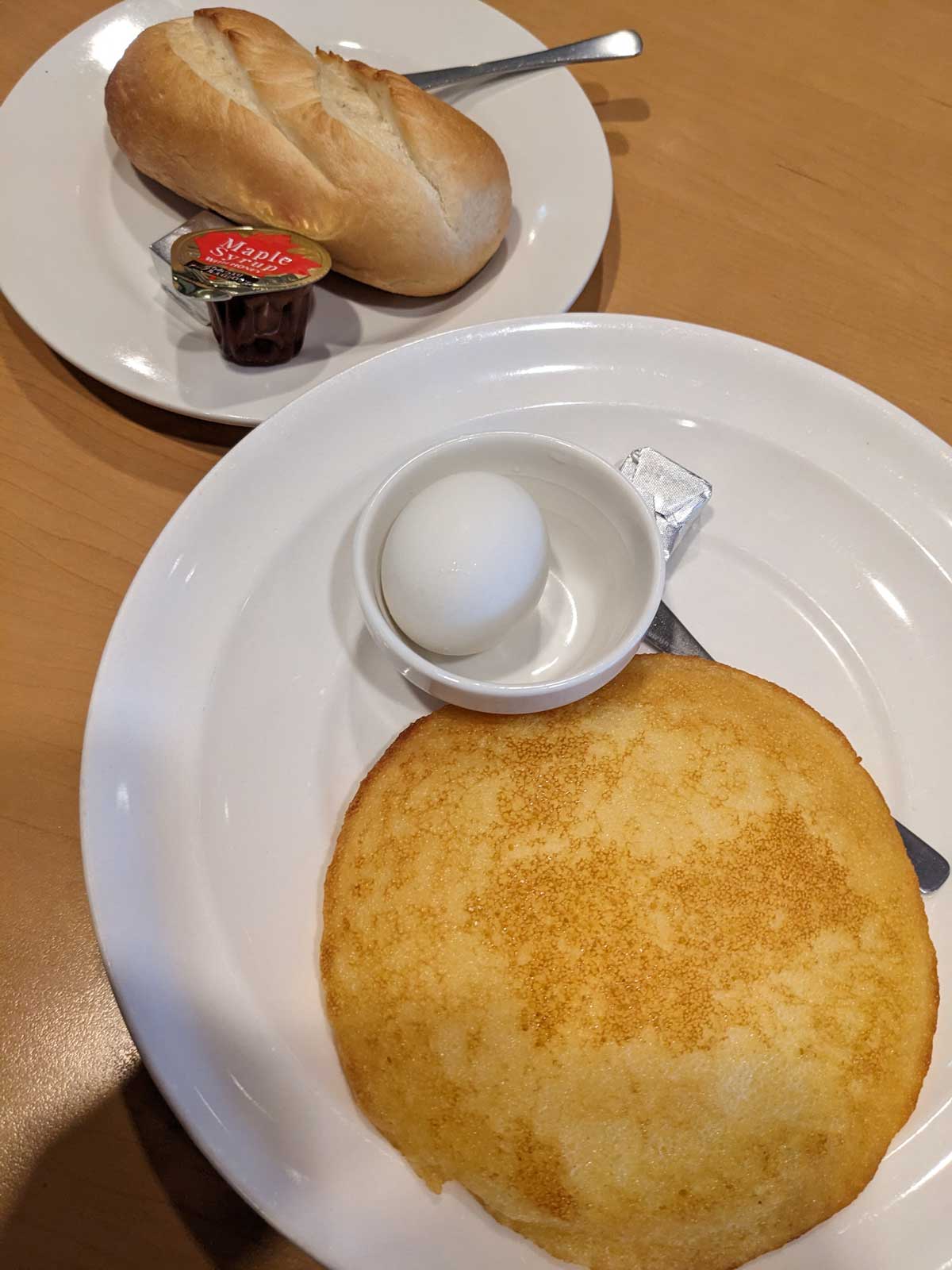 ホットケーキのモーニングにフランスパンを追加したら、お腹がいっぱいになった。 40分くらいの一時だった。