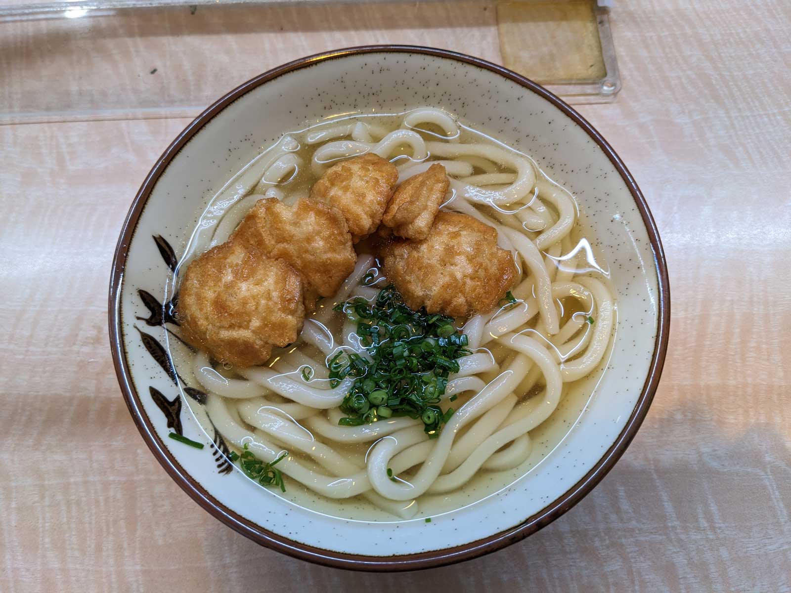 乗船してからは朝ごはんにうどんを食べる。 小豆島のせんべいが入っているうどんを食べた。