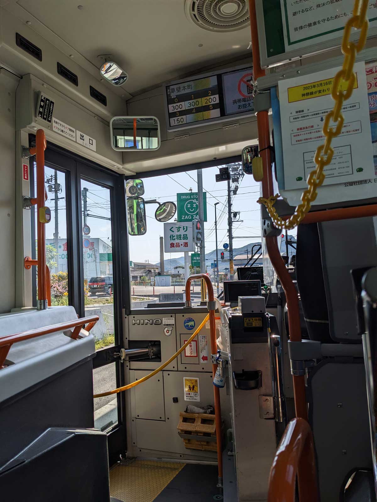 草壁港に到着したのが8時ちょうどくらい。 フェリーが遅れたおかげでちょうどいい時間だった。 草壁港の駐輪場に自転車を止め、バス停へ。 8時28分のバスに乗ってロープウェイ駅の紅雲亭を目指す。 香雲亭は終点で、ここから10分くらいで到着するみたい。 バスはぐいぐいと坂道を上っていきあっという間に紅雲亭に着いた。 バスに乗りながら道を眺めていたが、この坂道を三女が上るのは無理だな…… 自分はロードバイクなのでいけるだろうが…… 料金は300円で、子供は半額なので450円を、乗車チケットと一緒に料金ボックスに入れるという、昔ながらのバスの乗り方だった。
