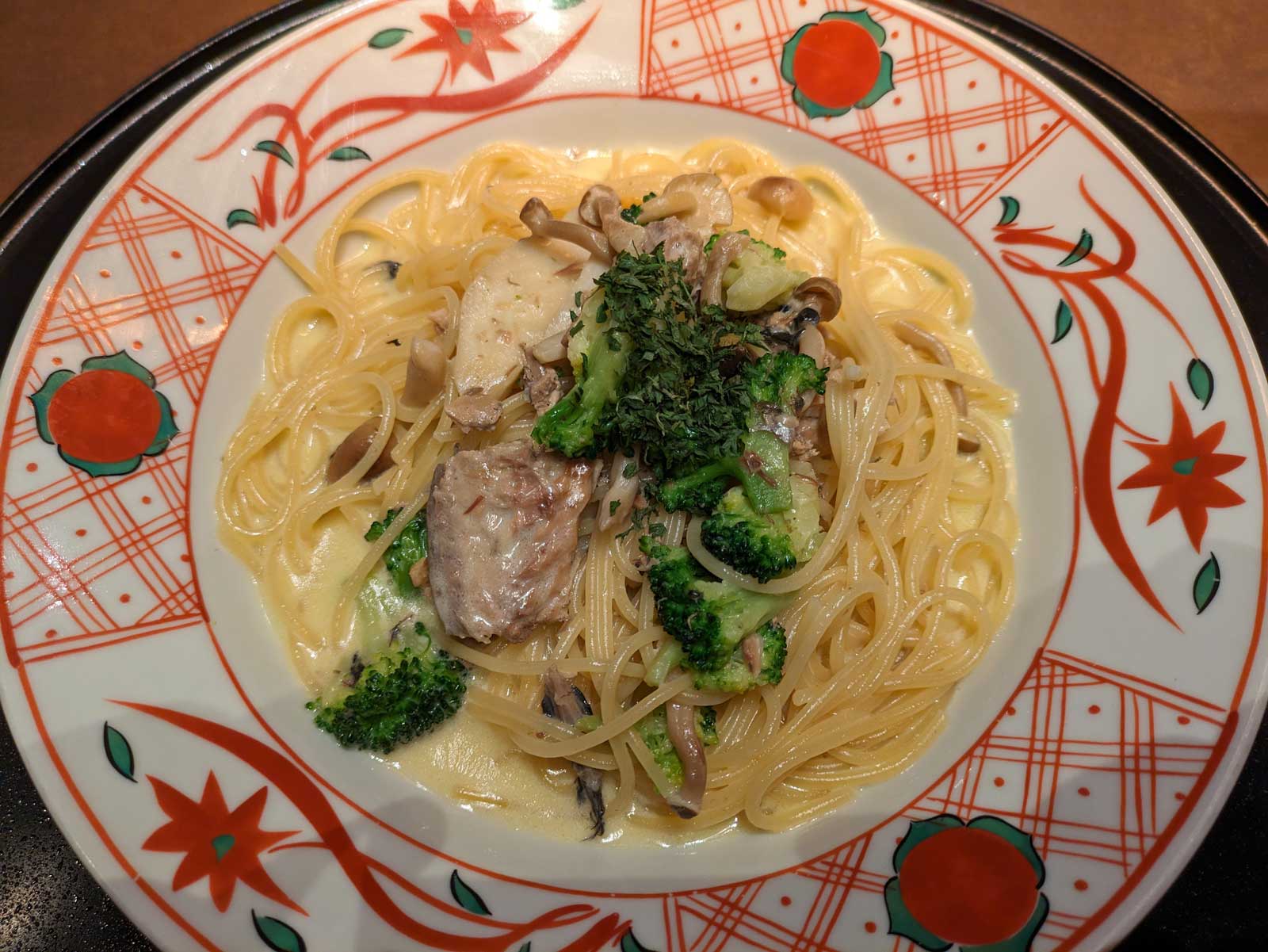 その後、ニトリに行ってきたが眠すぎて大変だった、家に帰ってから2時間くらい昼寝。 子供たちの夕飯は吉野家の牛丼だが、自分と妻は「洋麺屋五右衛門」で鯖ときのことブロッコリーのクリームソース。