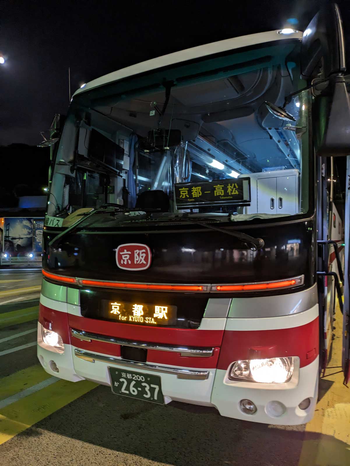 16時40分高松駅発の高速バスで京都駅を目指す。 バスには5人しかお客さんが乗っていない。 「発車オ~ライネット」の早割21で購入して、4,110円だったのだが、お客さん5人だと20,000円くらいしかチケット代の売上が上がらないが、高速道路代だけでそれ以上かかるだろうし、採算取れているのだろうか? たまたま乗客が少ない便だったのだろうか。
