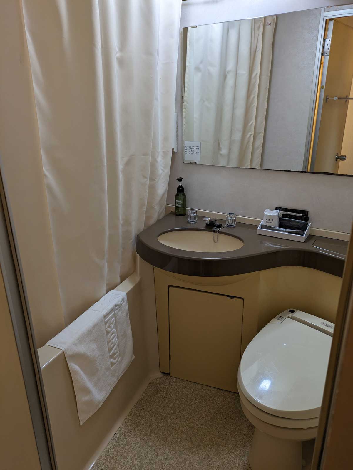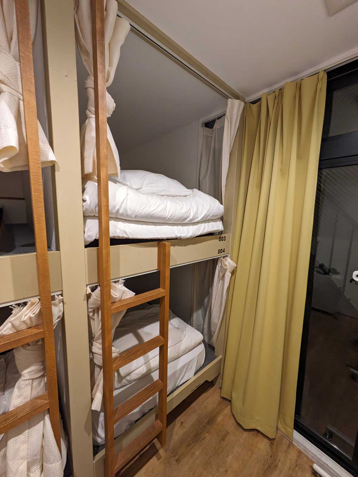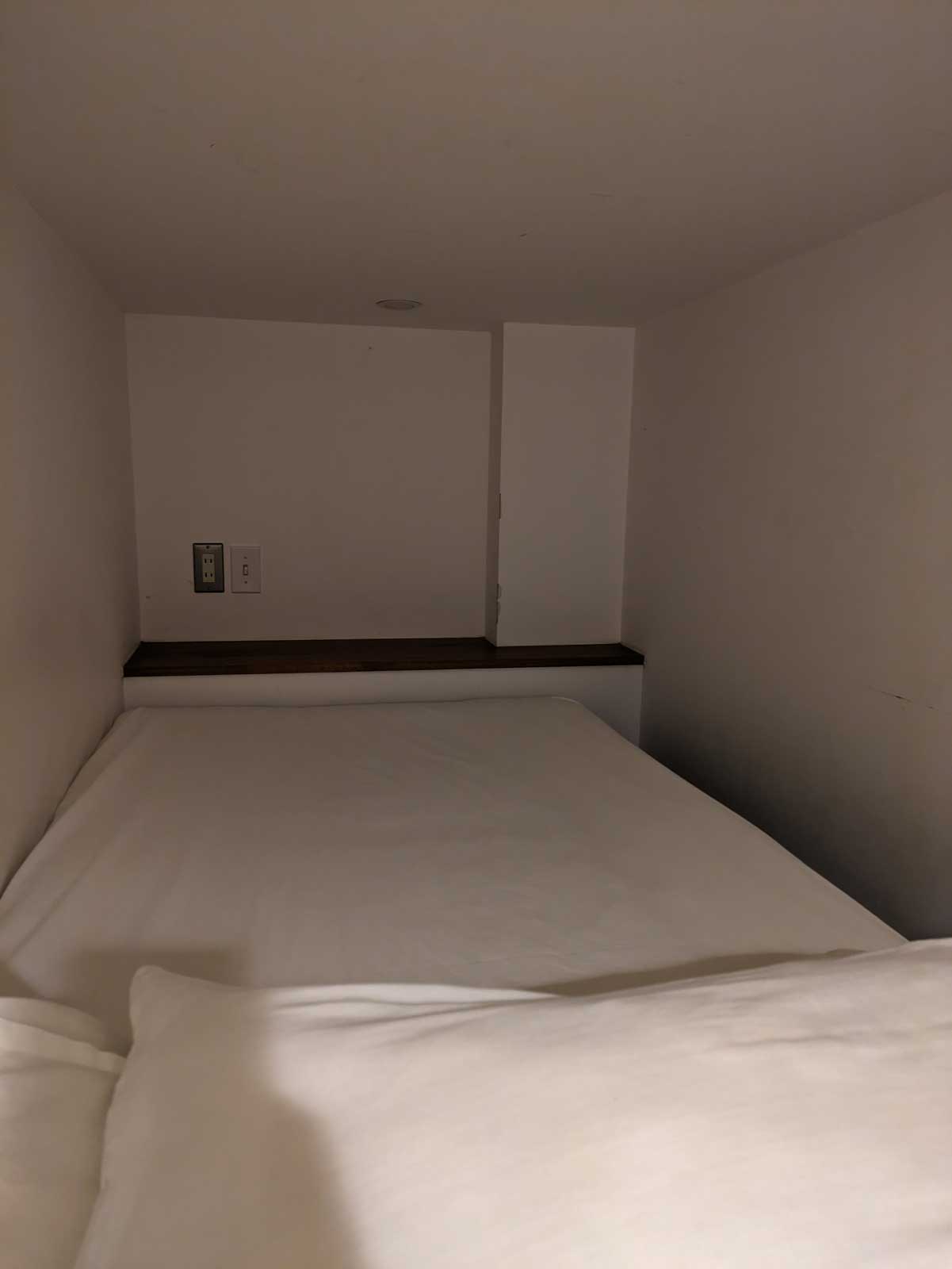 泊まる場所は「THE NEXT DOOR Dormitory & Private Hostel」というゲストハウスみたいなところ。 京都はただの経由地で寝るだけでいいので、できる限り宿泊費を抑えたかった。 Booking.comで予約して、3,305円だった。 Googleのレビューでは2.7点という低評価なので、どんなところだか気になってはいたが、個人的には寝るだけなので特に気にならなかった。 1Fで受付をして、2Fがフリースペース、3Fに部屋とトイレ、シャワー室がある。 飲食はフリースペースでのみ。 部屋は寝る場所が4つ作れていて、自分は上の段だった。 今日は3人しか泊まらないみたい。