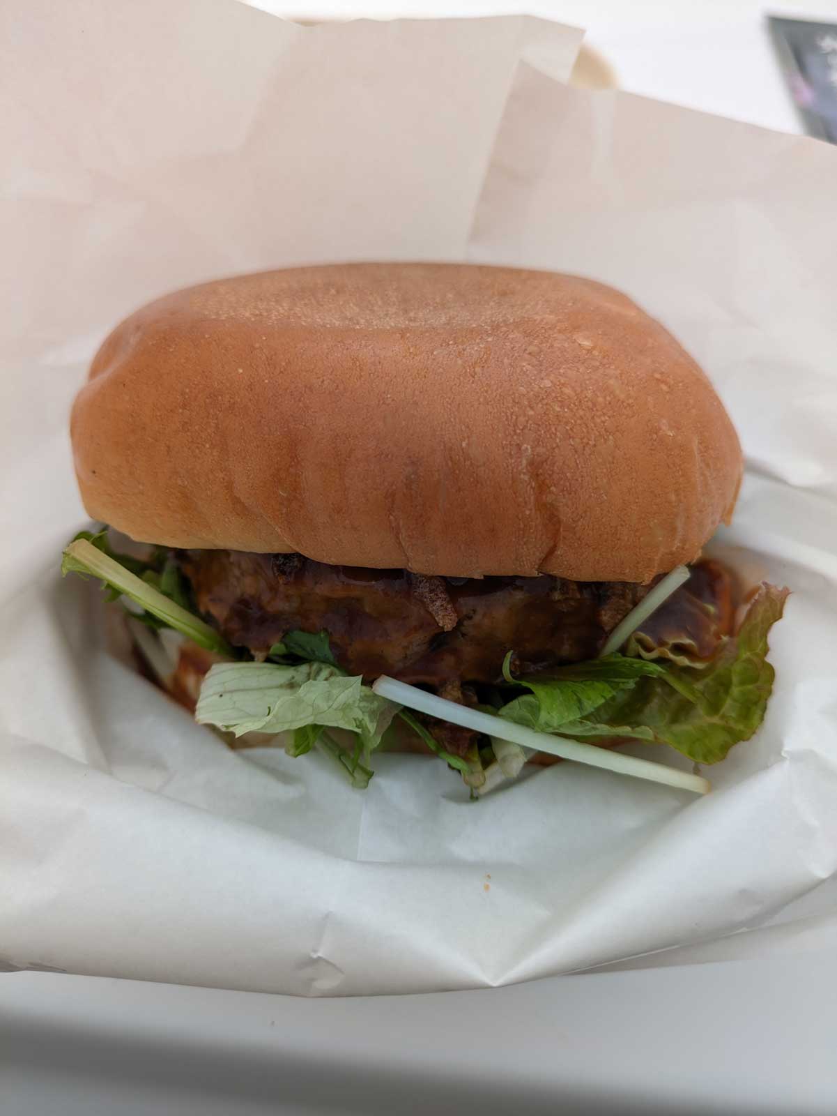 石川県立美術館には25分くらいで到着。 サイクルポートに自転車を返却する。 香林坊という繁華街を通ってきてしまった為、ここまでお昼ごはんを食べられそうな店がなかった。 ちょうど美術館の前の広場にキッチンカーが来ていたので、1,000円もするハンバーガーを購入。 軽く雨が降っていたのもあって、全然お客さんがいなかったが……