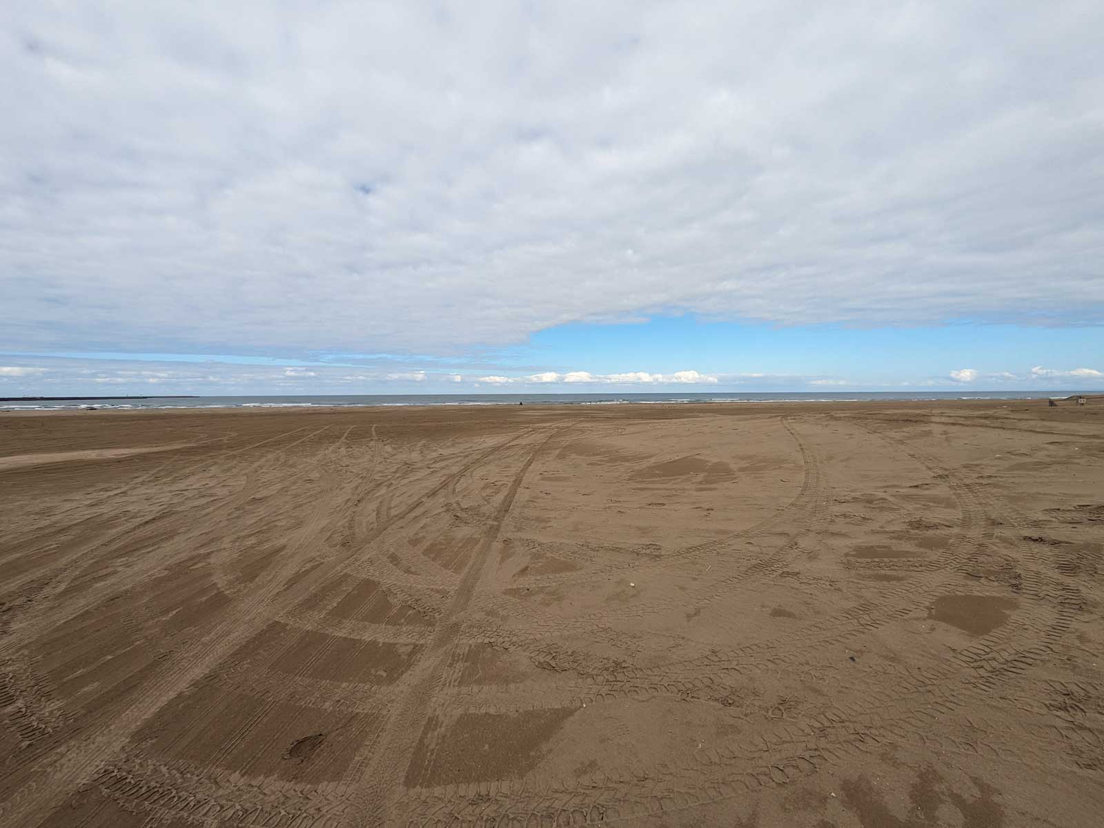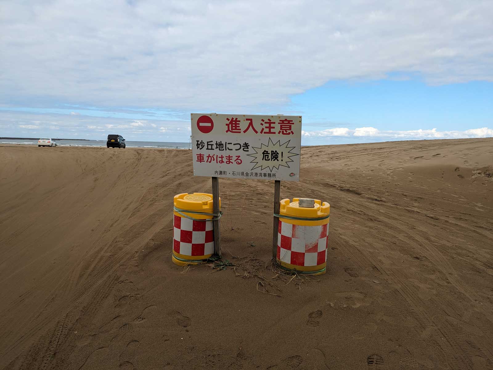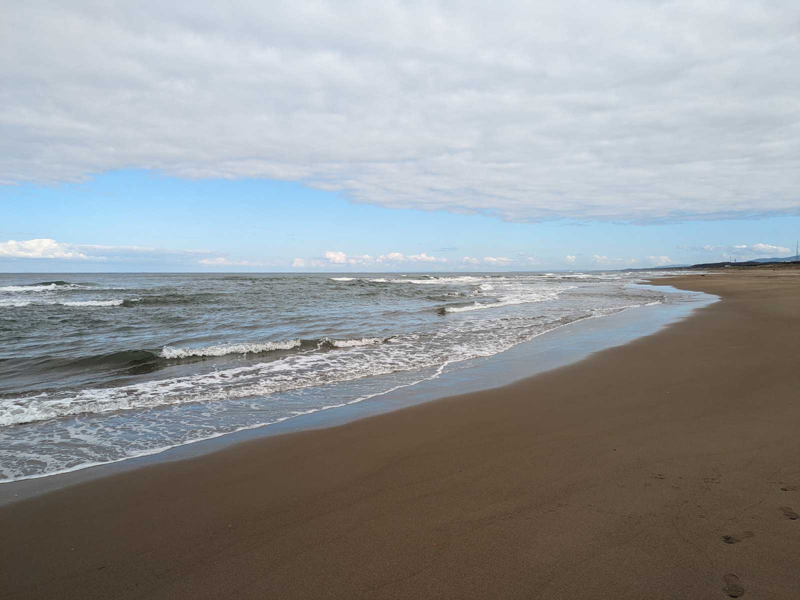 内灘海岸まではすぐに到着。 砂浜に車の乗り入れができるようで、何台も止まっていた。 自分も自転車で行こうと思ったが、砂浜に入ってすぐ、タイヤが砂にとられて全く進めず断念した。 海沿いまでは歩いていこう。 砂浜ではゴルフを練習してる人がいたり、サーフィンをやっている人もいた。 砂浜は綺麗だけど、日本海は荒々しかった。