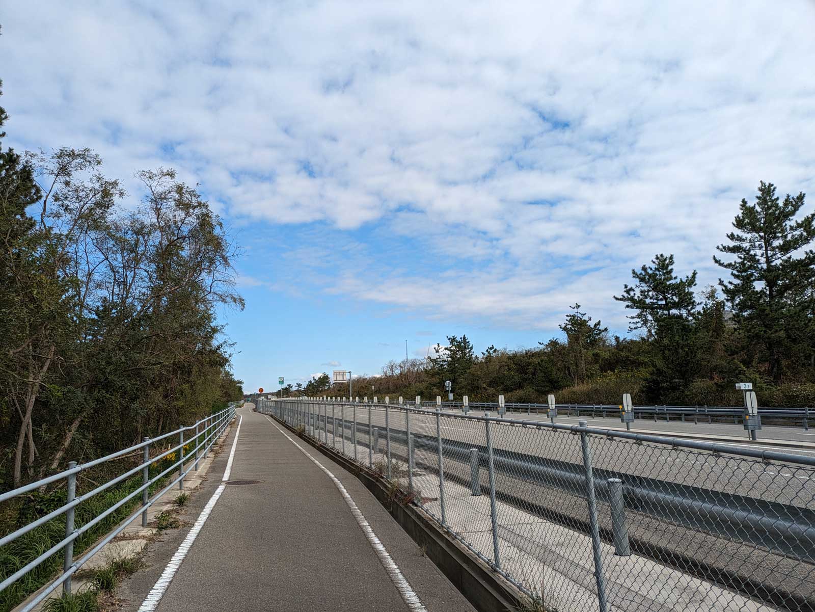 さて、これから高松駅に向かってサイクリングロードを走っていこうか。 GoogleMapによると、高松駅まではここから20kmくらい。 電動自転車なので、20kmはそれほど大変ではないだろう。 サイクリングロードは高速道路の真横を通れて、非常に快適で気持ちがよかった。 途中から海沿いを走るコースに変わったり。 そして驚いたのが、このサイクリングロードの距離。 「いしかわ里海めぐりルート」というコースで、なんと373.3kmもあるようだ。 石川県はサイクリングコースが充実しているようだ。