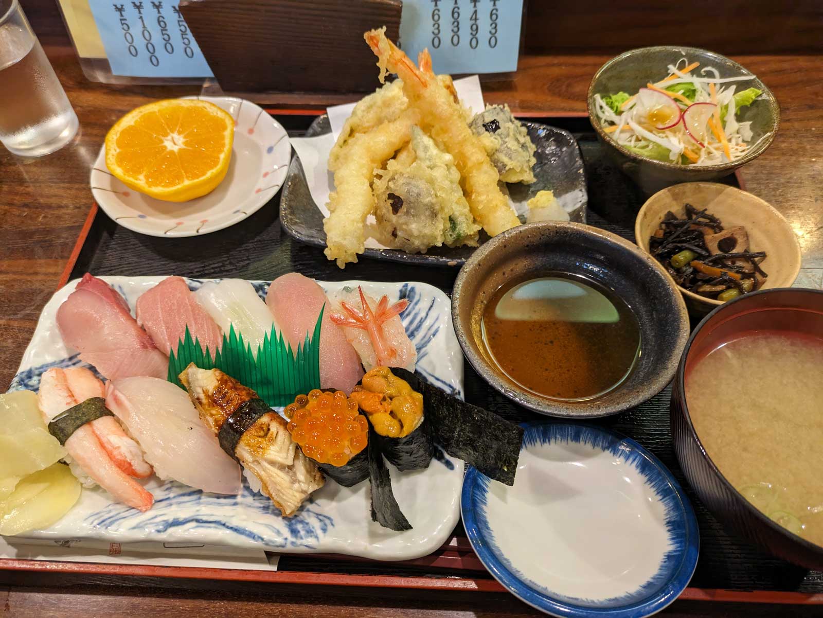 時刻は11時半、この近辺でお昼ごはんを食べてから内灘に戻ろう。 スマホで近辺のレストランを探したら、1kmくらい離れた場所にある「りょう門」という寿司屋を見つけた。 昨夜寿司食べたけど、せっかくなのでそこに行ってみよう。 行ってみて大正解、結構な人気店のようで、自分が入ってからすぐに待ち行列が出来るほどだった。 3,200円もする「りょう門上ランチ」を食べてお腹いっぱい。