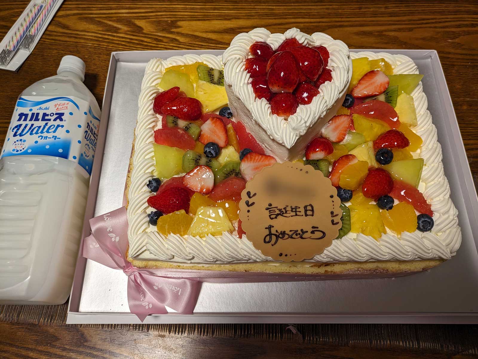 今日は三女の誕生日なので、昼にダイソーに飾り付けの風船などを買いに行って、ルーヴにケーキを取りに行く。 「お腹いっぱいケーキを食べたい」というので「フルーティパーティM」というケーキを予約していた。 Sサイズは以前食べたことがあって、それでもかなり大きいのだが、なんとか食べ切れるサイズ。 今回のはさらに2倍位大きいのでどうだろうか?