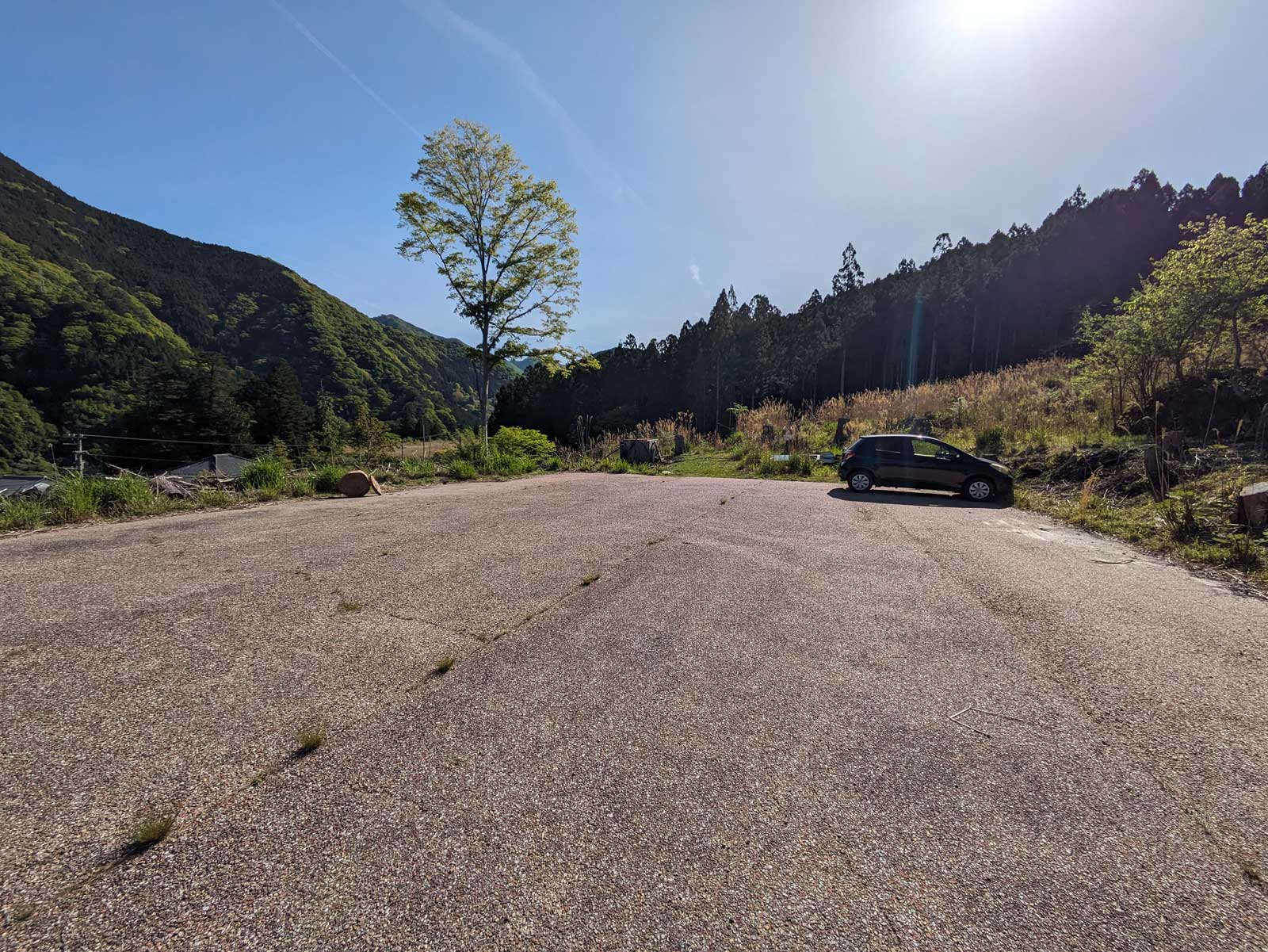 登山口前の駐車場は、大木に覆われていたはずだったが、大木は全て切り倒されて開けた場所に変わっていた。 付近の木々は全て切り倒されていて、以前の面影が全く無い。