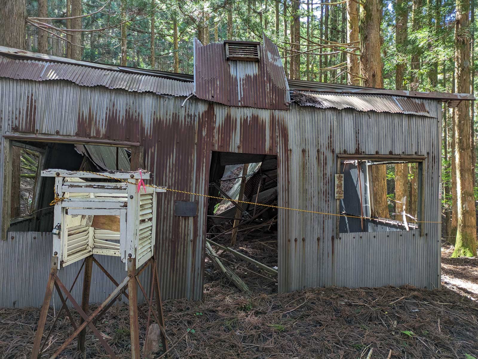 1時間10分ほど歩いて、旧造林小屋に到着した。 小屋は倒壊寸前で、立ち入らないようにロープが貼られていた。 以前よりは確実に倒壊の危機が迫っていると思う。