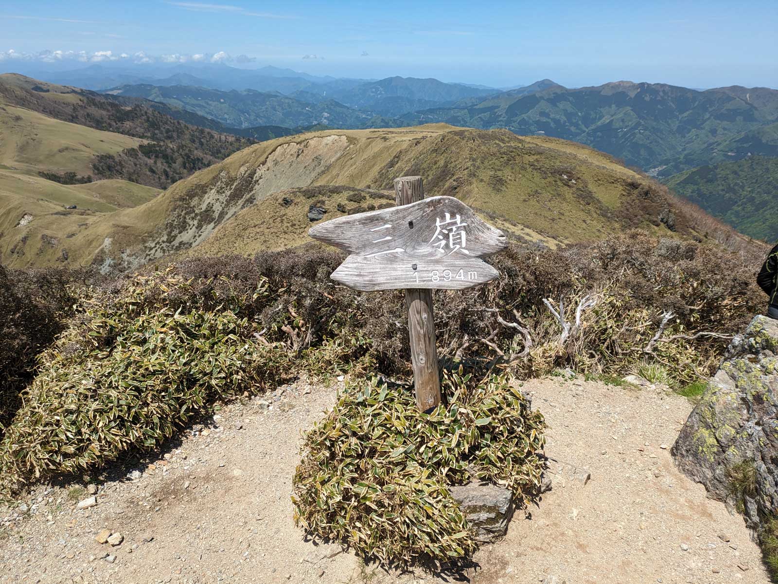 そこから数分で三嶺山頂。 山頂はさらに強風が吹き荒れていて一瞬で体が冷え、手が悴んでくる。 寒すぎるのでレインコートの上を羽織る。 山頂でお昼を食べようと思っていたが、この風じゃ無理だな……