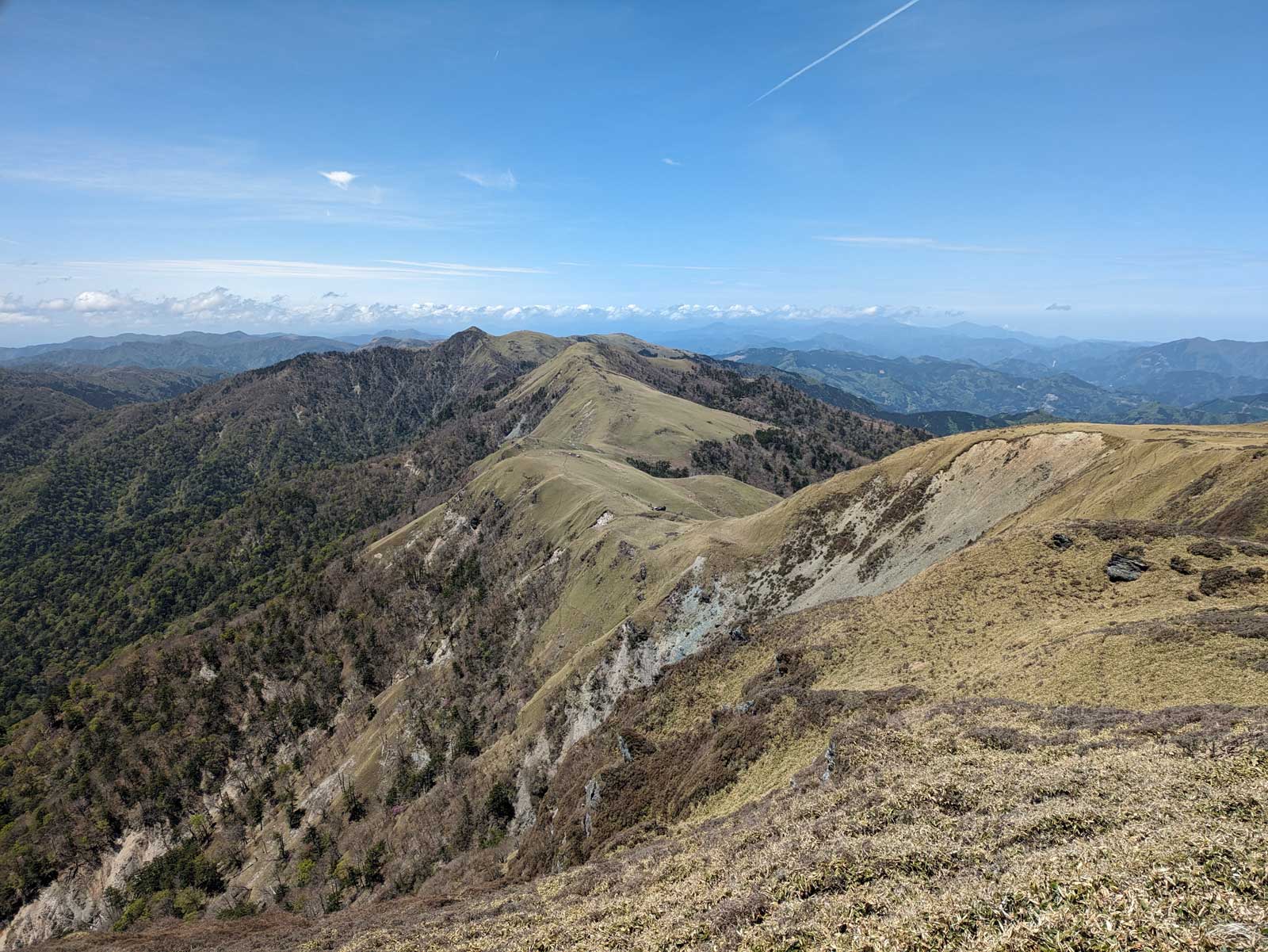 そこから数分で1791m地点。 目の前に三嶺が見える素晴らしい場所。 肉眼でも人がたくさん歩いているのが見える。 この場所で少し休憩、開けた場所に出ると風が強くて少々肌寒い。