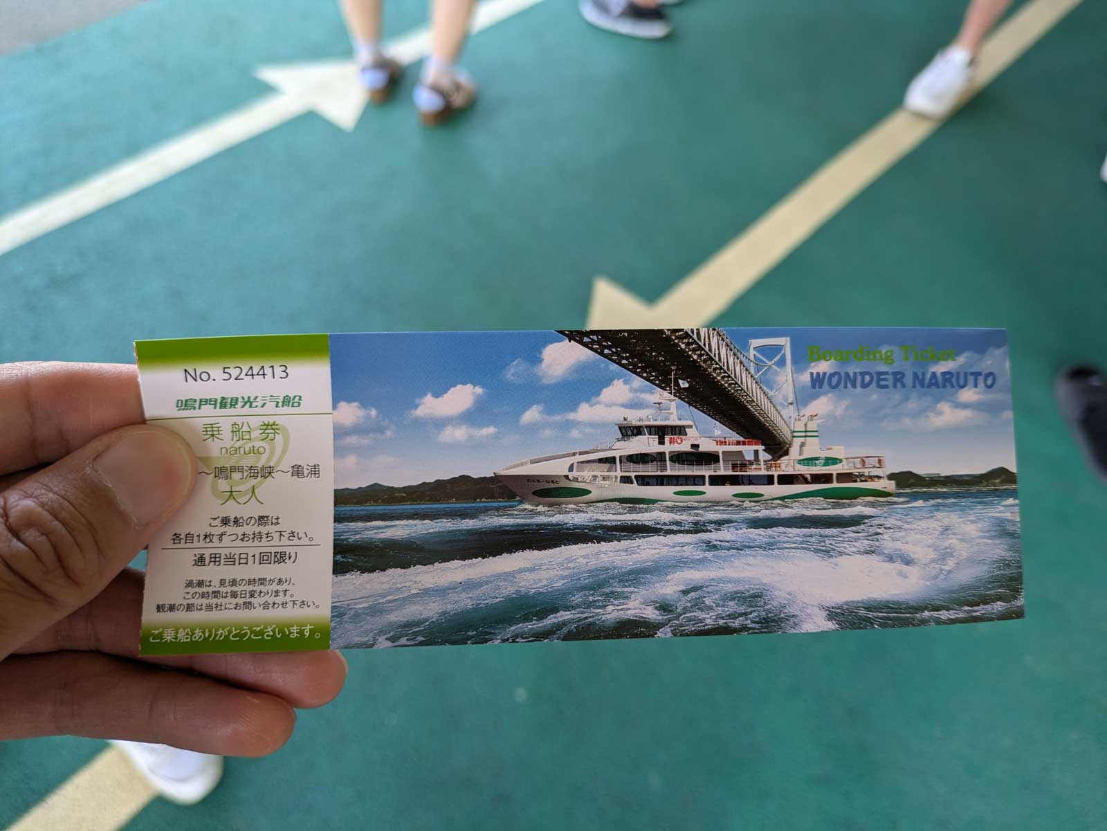 船が港に戻ってきて、前のお客さんが降りてから自分たちが乗り込む。 船首に向かって左側の壁沿いに立っていた。 船が出向して、鳴門大橋が見えるあたりでは「やっぱり右側のほうが良かったかな」と思ったが、渦潮地帯に到着した時は「左側で良かった」と思った。 鳴門大橋が綺麗に見えるのは右側だが、渦潮のメインは左側だったので。 乗船券に大人+1,000円、子供+500円払うと一等席のチケットにすることができ、一等席は2Fで空いているため、右や左に自由に移動できると思う。 ただ、海面からの距離が少し遠くなるので、迫力度は下がるかもしれない。