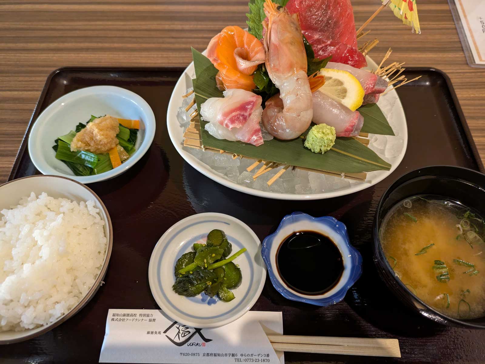 最後に「福知山鉄道館フクレル」を見学して、福知山城の駐車場に併設されている「ゆらのガーデン」の「魚福」という店で刺身定食を食べる。