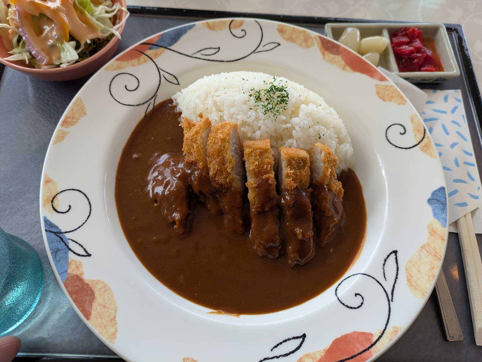 前半終わったのは9時半くらいで、後半は10時半スタートらしい。 その間にレストランでお昼ごはんを食べるとのこと。 まだ9時半なのにもうお昼ごはんなのね? 朝からビール飲むのが普通らしく、4名の中、自分含めて運転手じゃない2名が朝からお酒を飲んでしまった。 食べたのはカツカレー。