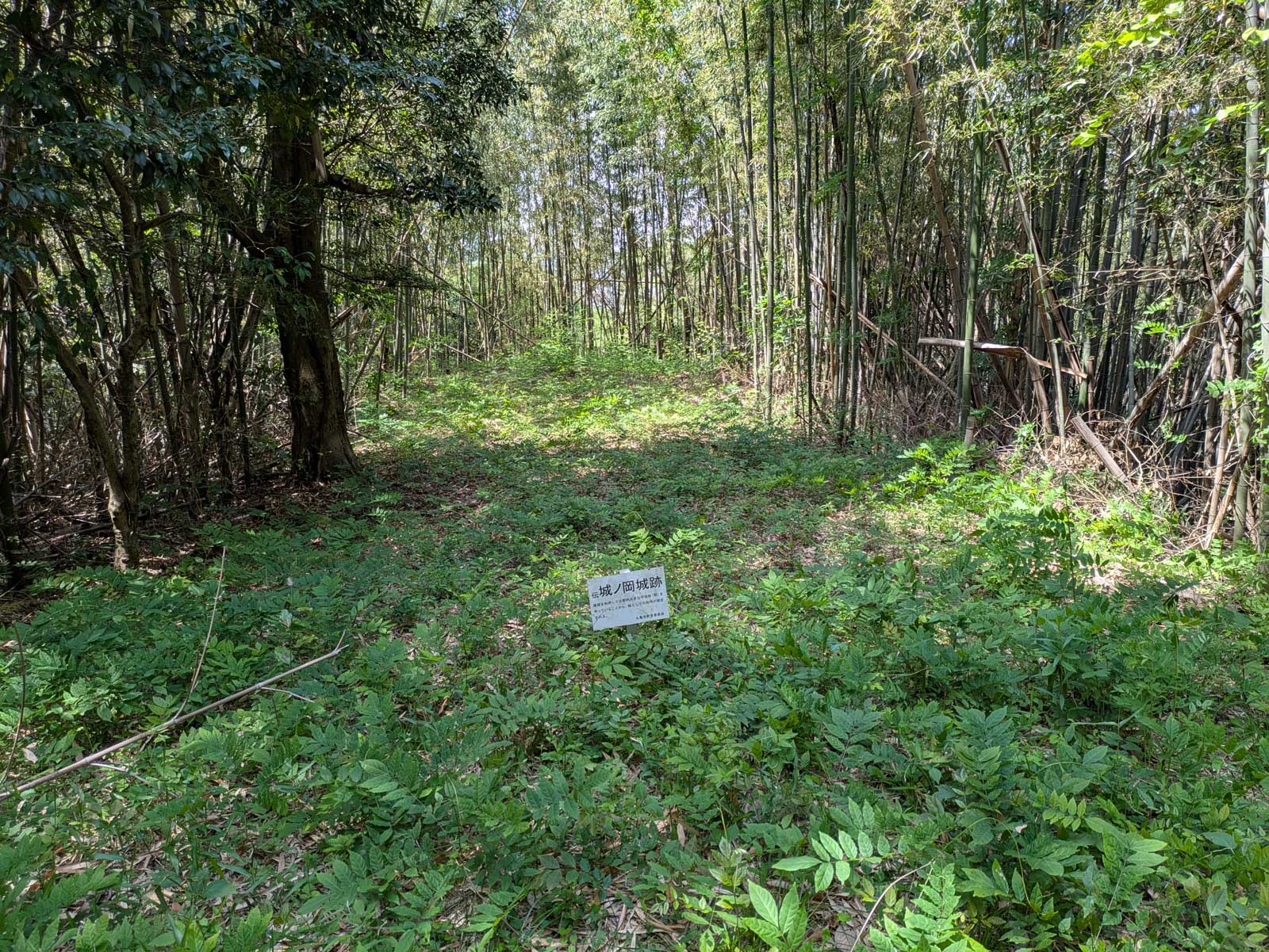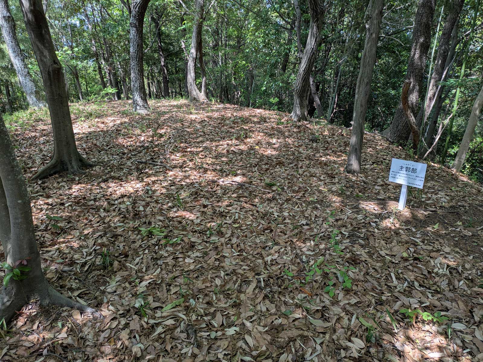 「城ノ岡城跡」「田村城跡」などを経て、25分くらいで「主郭部」に到着。 ここに本来城があったはずなのだが、500年くらい前の時代の事なので、今はもう積石すら無く、ただ平らな地面があるだけだった。 500年間放置したら木々も生え放題なはずだけど、今でも平らにしているってことは、いちおうメンテナンス的なものはやっているのだろうな。