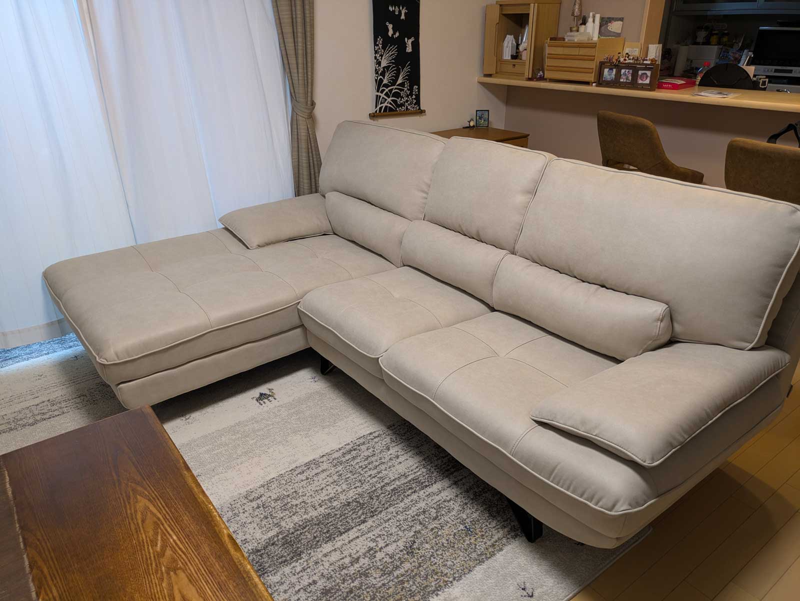 ソファを設置してもらったが、テーブルが木目調のこたつだし、ソファに対してのサイズも合ってないので、余裕ができたら買い替えないといけないな。
