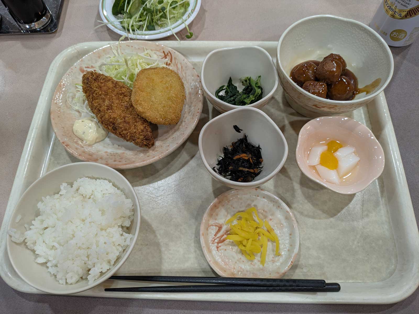 夕食は日替わり定食かカレーライスの二択で、日替わり定食にした。 サラダバーとドリンクバーもついている。 アルコールの自動販売機もあり、スーパーで買うより100円くらい高いが購入してビールを飲む。