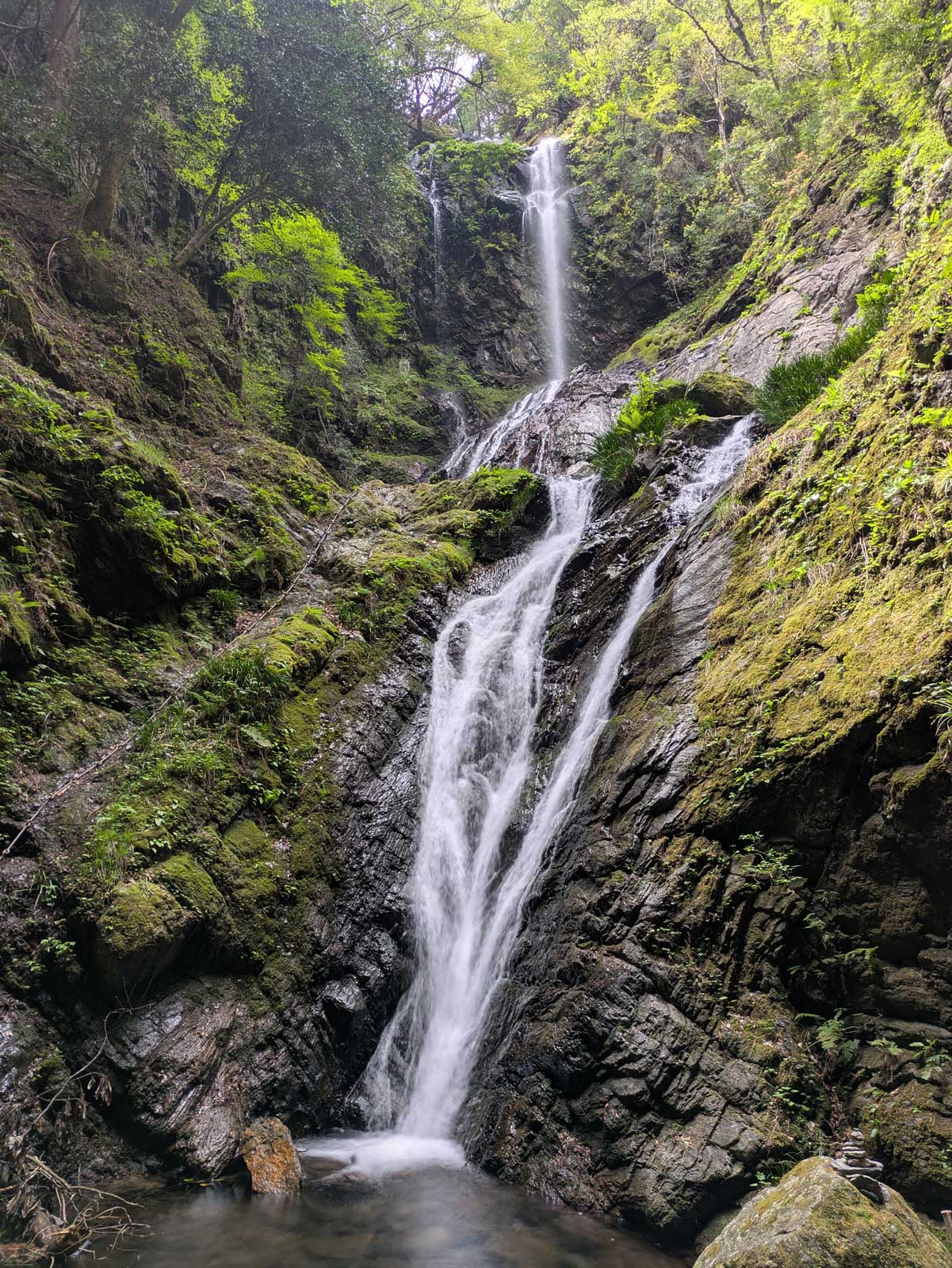 山の中でひんやりして、滝の流れは綺麗で音も良い。 静かな雰囲気の場所で20分くらいくつろいでいた。 結構人気スポットらしくて、何組も滝を見に来た人たちがいた。